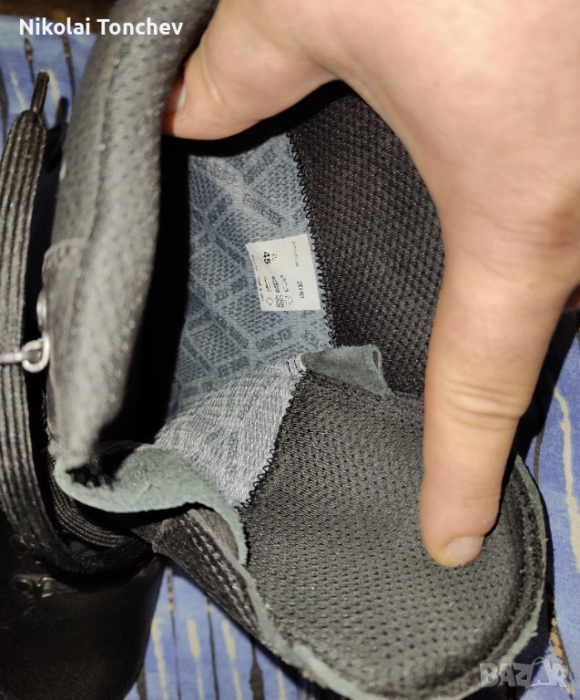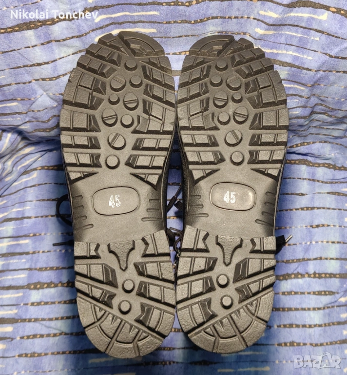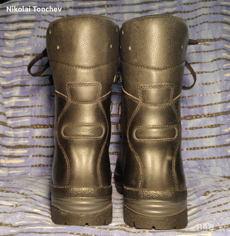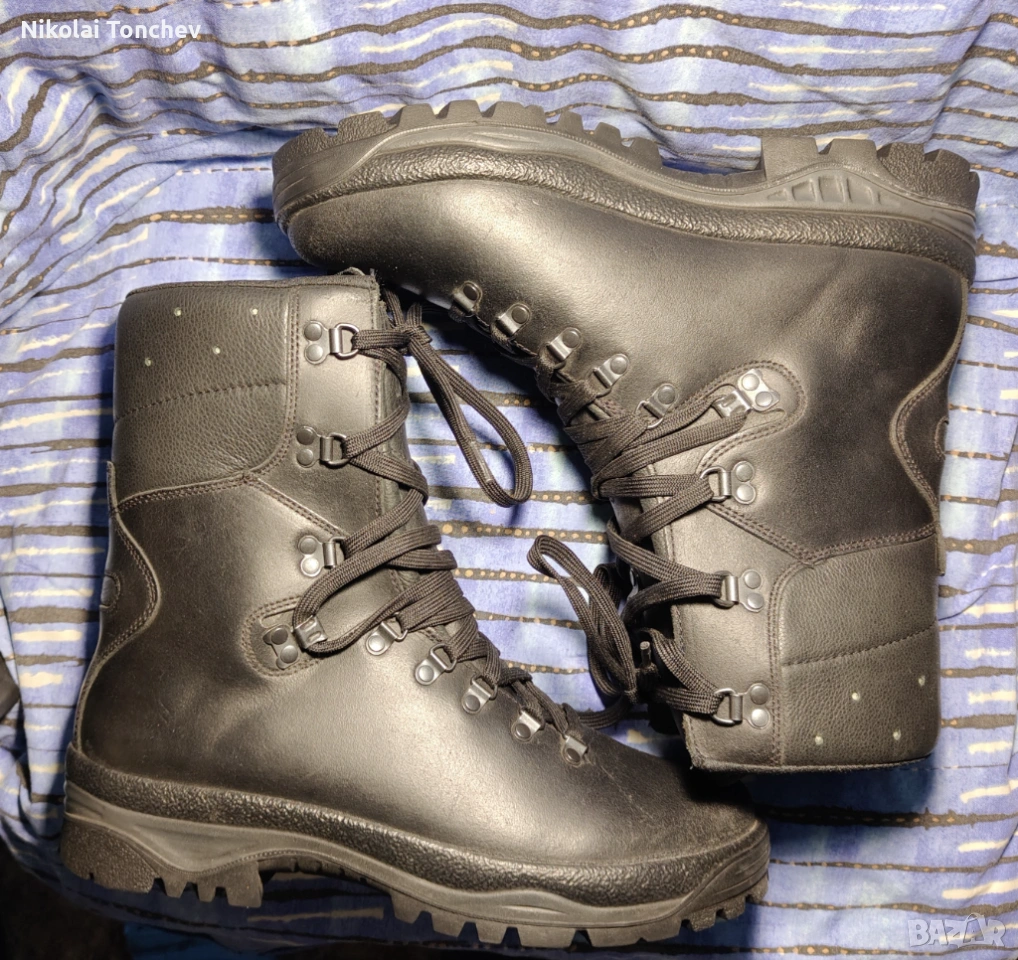 Нови високи 250 мм армейски обувки закупени от магазин за ловно и охранително оборудване в Белгия, произведени за армията с номер на договора посочен на табелката отвътре.