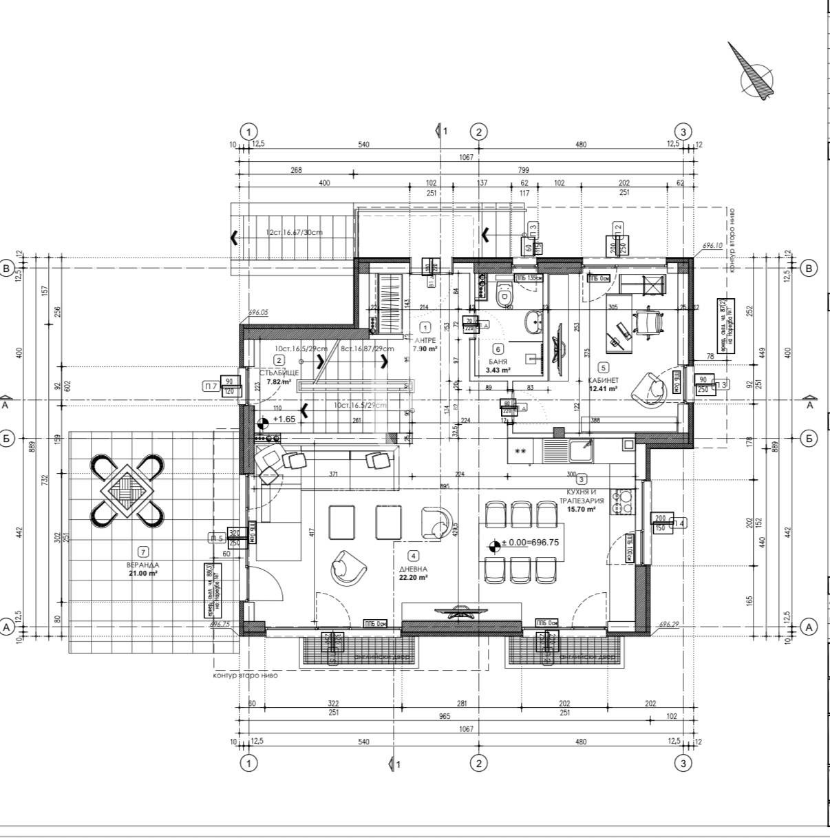 Първо ниво: хол с кухненски бокс и трапезария, излаз към двор, тоалетна за гости, кабинет