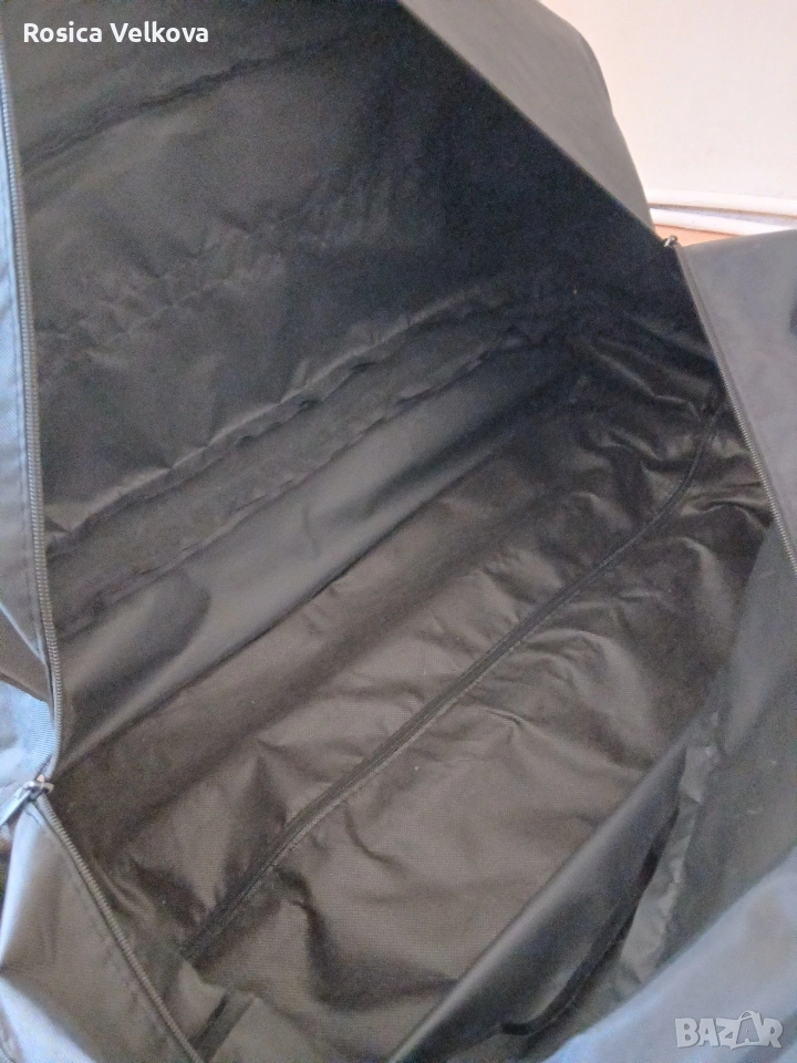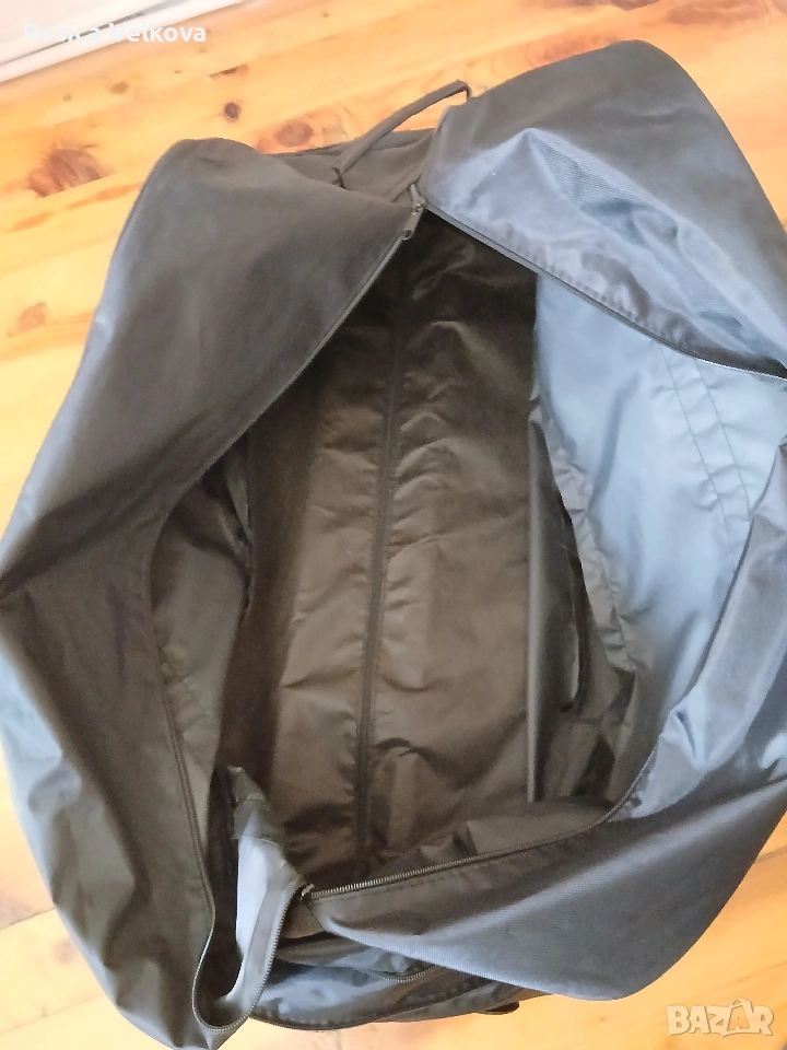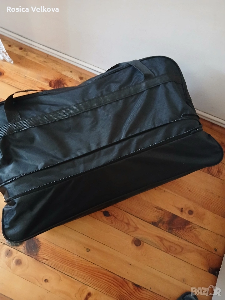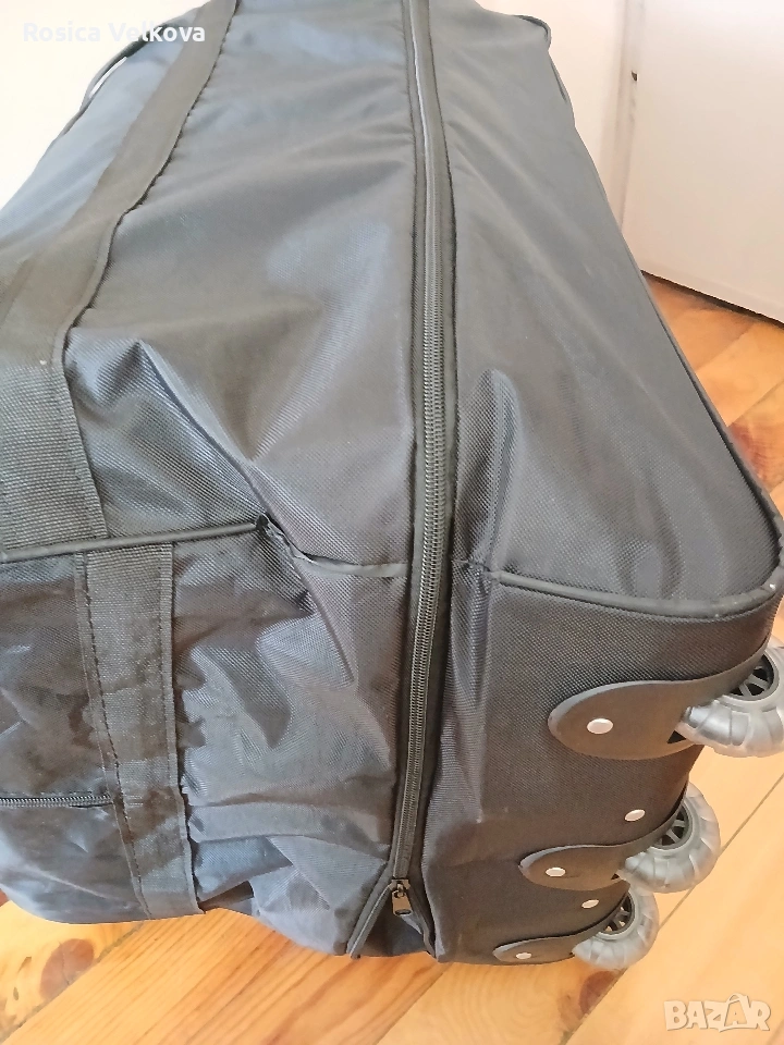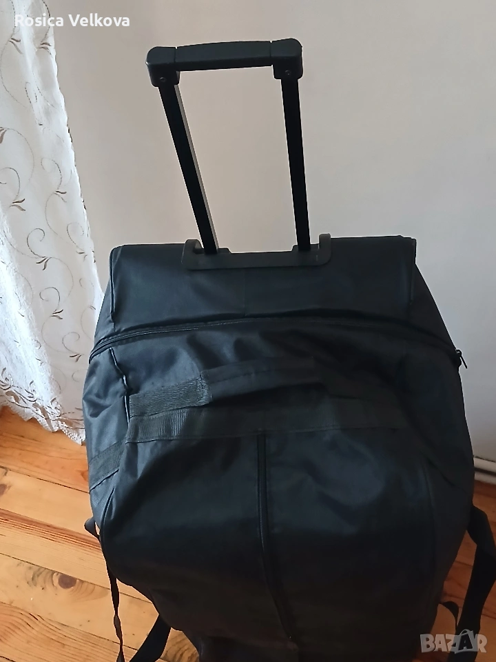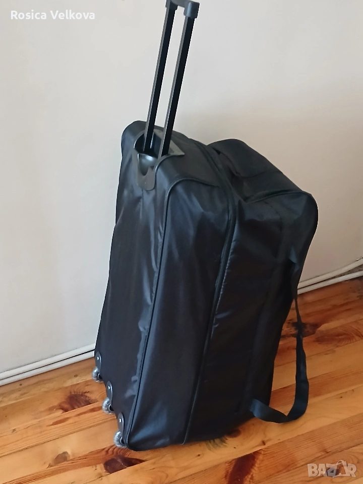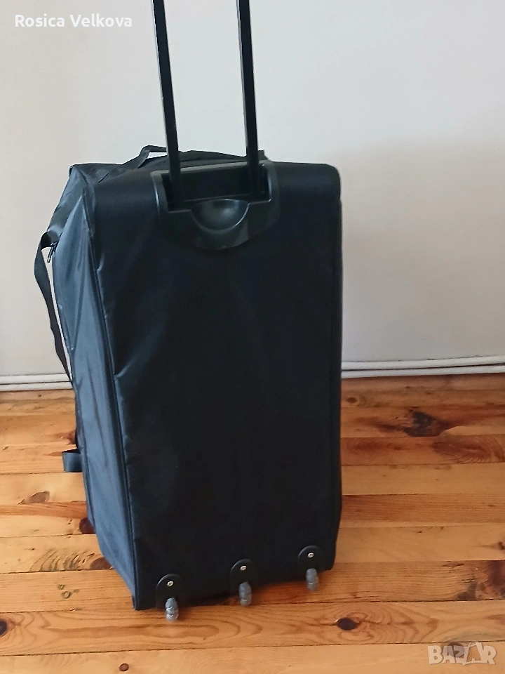 Страхотен голям сак черен цвят твърдо дъно с три колела побира до 35 кг с изтегляща дръжка, цип за разтягане , двустранно закопчаване много здрав за много багаж. Може да се носи с ръка ,на гръб и да се тегли. дължина 80 см височина 48 см ширина 37 см .Върши страхотна работа