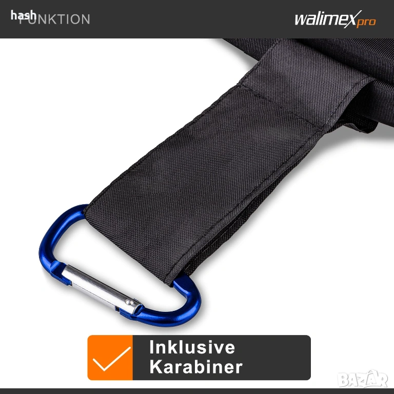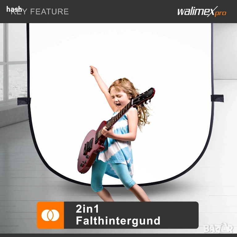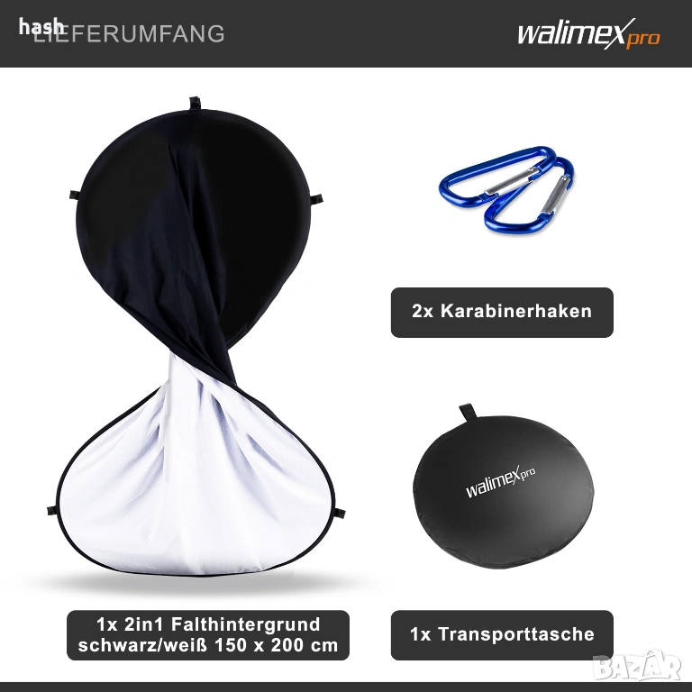 Този сгъваем фон е универсален помощник за вашите снимки - както в студио, така и на открито. Може да се използва в портретен и пейзажен формат, а също така може да се окачи на стативи или стени с помощта на пет бримки и две включени карабинери. Може да се сгъне до 65 см само с няколко стъпки. Включена е чанта за транспорт и съхранение.
