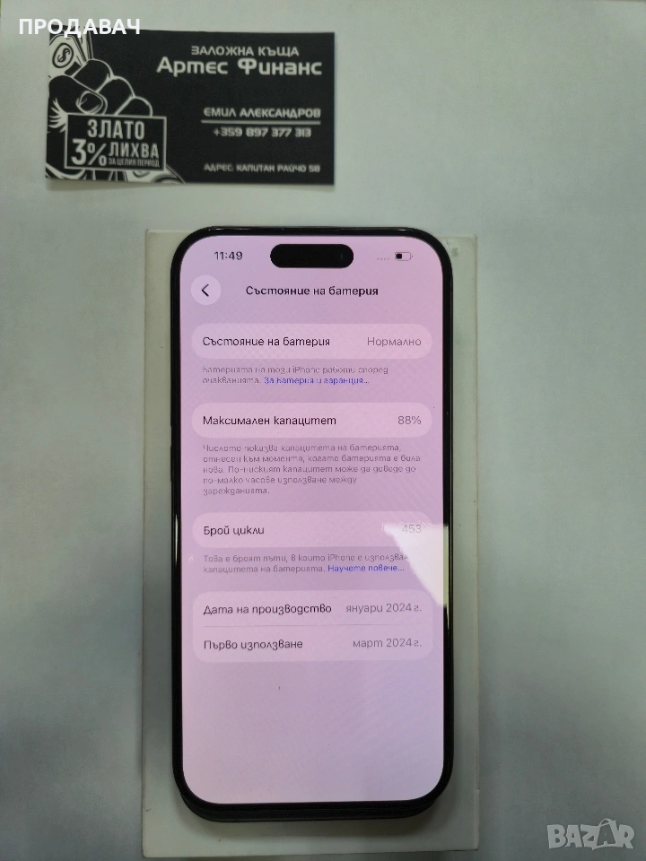 Телефонът е като нов без забележка 128GB. Батерията е на 88% капацитет, на 453 цикъла на зареждане. Има остатъчна гаранция до 14.03.2027 година. Изпращаме с опция преглед и тест за цялата страна.