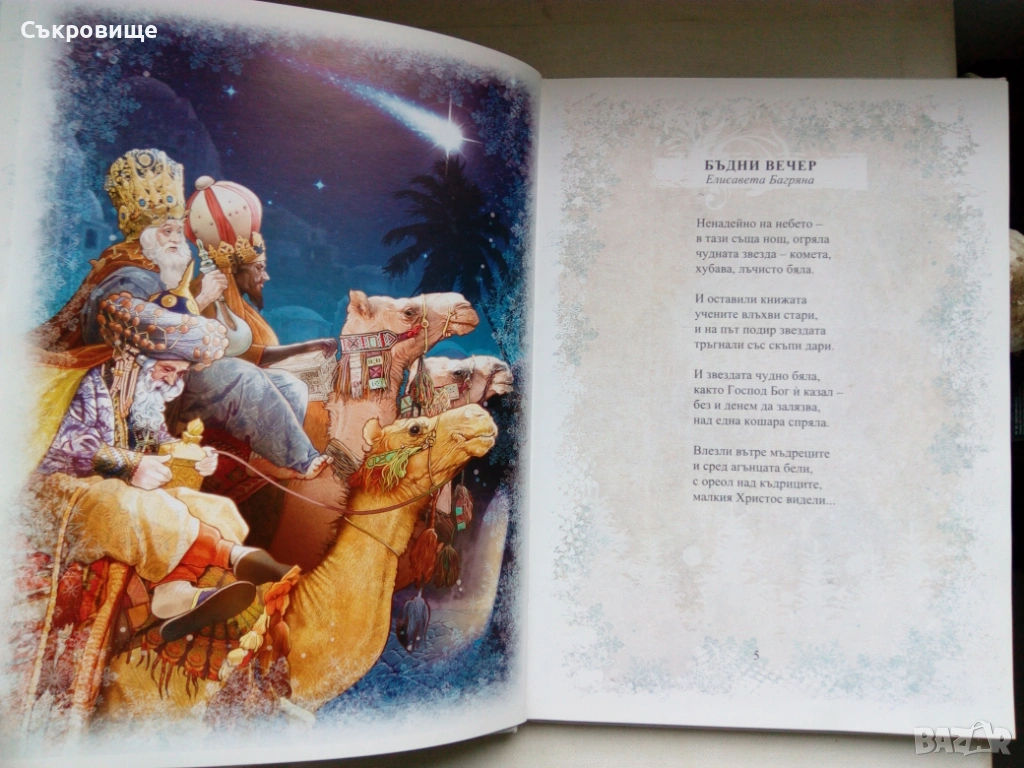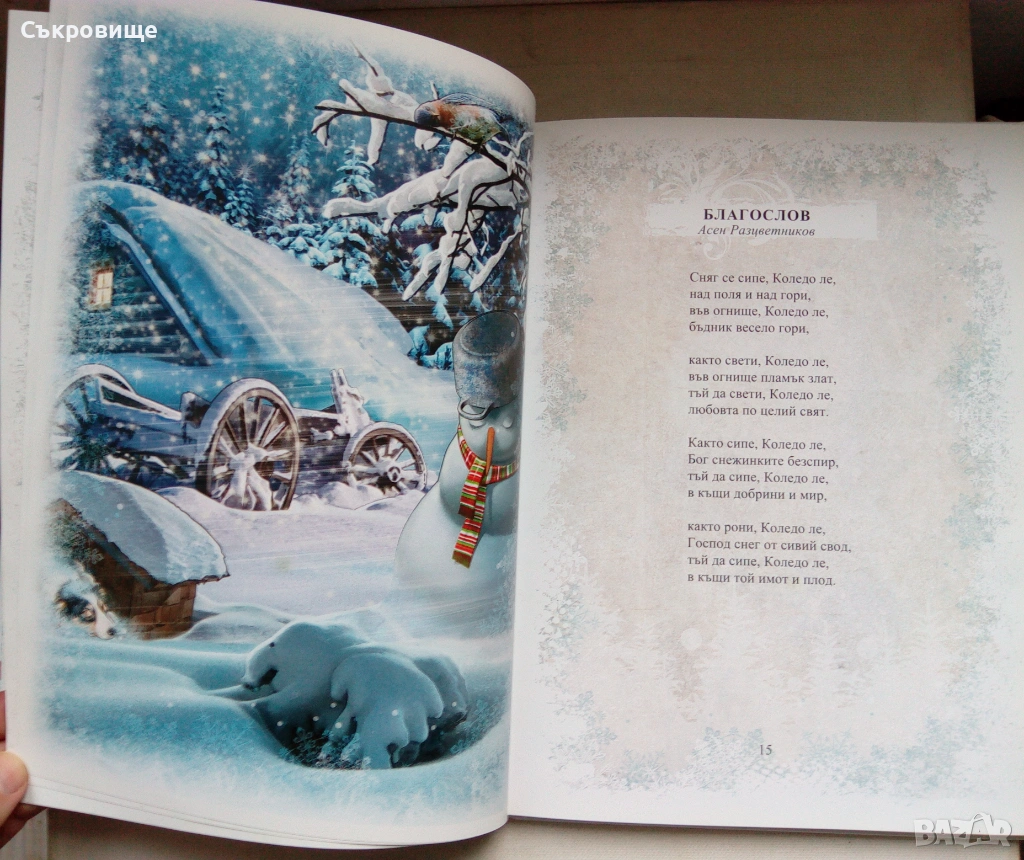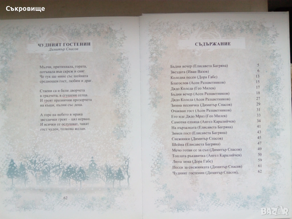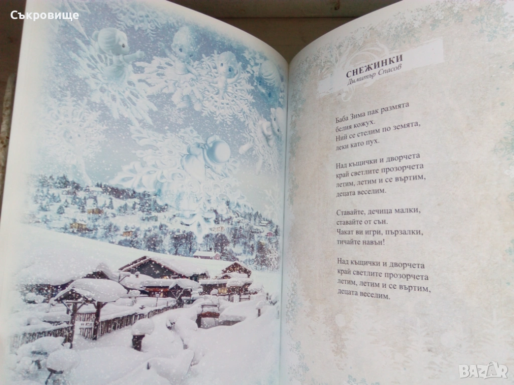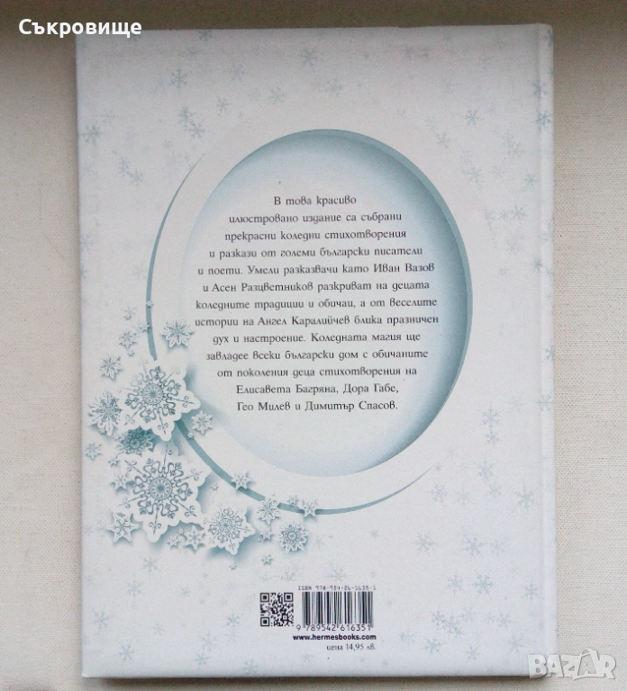 В това красиво илюстровано издание са събрани прекрасни коледни стихотворения и разкази от големи български писатели и поети. Умели разказвачи като Иван Вазов и Асен Разцветников разкриват на децата коледните традиции и обичаи, а от веселите истории на Ангел Каралийчев блика празничен дух и настроение. Коледната магия ще завладее всеки български дом с обичаните от поколения деца стихотворения на Елисавета Багряна, Дора Габе, Гео Милев и Димитър Спасов.