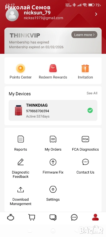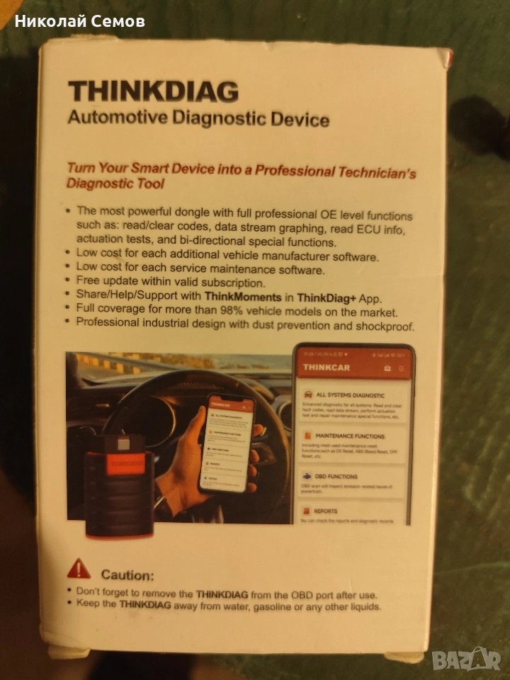 Уредът Thinkdiag е мощен диагностичен инструмент. Той преобразува вашите Android / iOS устройства в професионален Bluetooth OBD2 скенер за персонализиране, диагностика и обслужване на вашия автомобил Продукта е оригинален и е съвместим само с официалното приложение ThinkDiag, което може да се изтегли свободно от IOS App Store и Google Play. Към софтуера за Android има вграден преводач, който превежда частично менюто на български език. Поддържа пълни функции obd2, ECU кодиране, активен тест, диагностика на всички системи и 16 услуги за поддръжка за 115 марки превозни средства. Този двупосочен инструмент за сканиране може да чете / изчиства DTC и да преглежда потока от данни за ВСИЧКИ системи за сигурност като ECM, TCM, ABS, SRS, BCM, IMM, BMS, TPMS, SAS, горивна система, светлинна система, система за чистачки и др. Той също така прави ECU кодиране, Активен тест, което ви позволява да тествате всеки задвижващ механизъм на системата, като прозорци или чистачки на предното стъкло, включване и изключване на горивната помпа , включване и изключване на различни компоненти за да се идентифицират причините за неизправност. ECU кодиране: Функцията за кодиране се използва се за препрограмиране на адаптивни данни за модулите за управление на превозното средство след ремонти или подмяна на части. 16 СЕРВИЗНИ RESET ФУНКЦИИ + АДАПТАЦИЯ + СЪОТВЕТСТВИЕ Освен функциите на OBDII режима, като четене / изчистване на кодове, четене на поток от данни в реално време, тест за сензор o2, скенерът Thinkdiag предлага 16 сервизни функции : 1. Нулиране на масло и сервизни интервали 2. Калибриране на ъгъла на кормилото 3. Електронно нулиране на ръчната спирачка 4. Регистър и поддръжка на батерията 5. ABS 6. Електронно нулиране на положението на дроселната клапа и обучение 7. Регенерация на филтъра за твърди частици (DPF) 8. Нулиране на системата за наблюдение на налягането в гумите 9. Обучения на модули 10. Обучения на системи против кражба 11. Съвпадение на инжектора MaEET 12. Нулиране на въздушното окачване 13. Нулиране на скоростната кутия 14. RESET на люка 15. Нулиране на AFS (EGR) 16. ERR нулиране АВТОМАТИЧНО ОТКРИВАНЕ НА VIN, ДИАГНОСТИЧЕН ДОКЛАД, ГРАФИКА НА ДАННИ, ЗАПИС НА ДАННИ, ВГРАДЕН ПРЕГЛЕД НА DTC След изтичането на първата безплатна година, за функционирането и ъпдейтите на уреда се заплаща. На това устройство годишният абонамент изтече. Затова и цената е такава. Цените на абонамент могат да варират поради промоционални кампании и др. Приложението се казва ThinkDiag+.