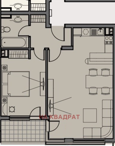 🏠 Апартаментът е светъл и функционален, с голяма всекидневна с кухненски бокс (30 кв.м. светла площ), самостоятелна спалня, баня с тоалетна и тераса.