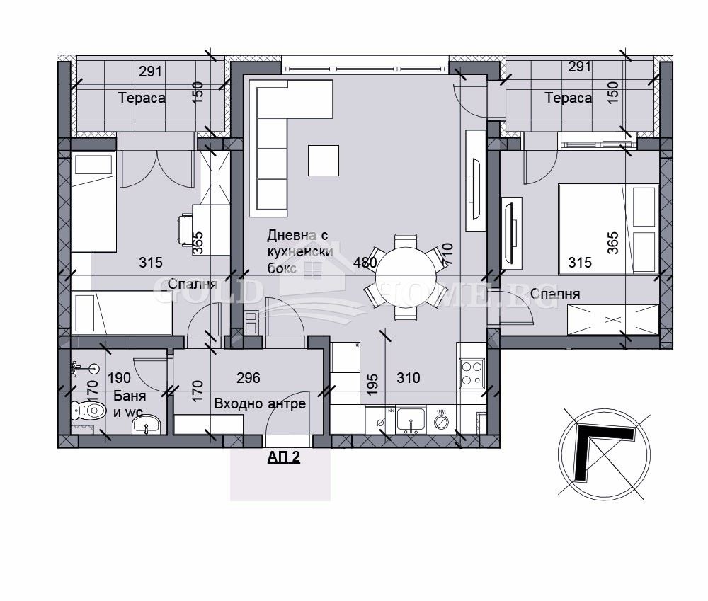Входно антре , Дневна с трапезария и кухненски бокс, две спални, баня с тоалетна и две тераси :