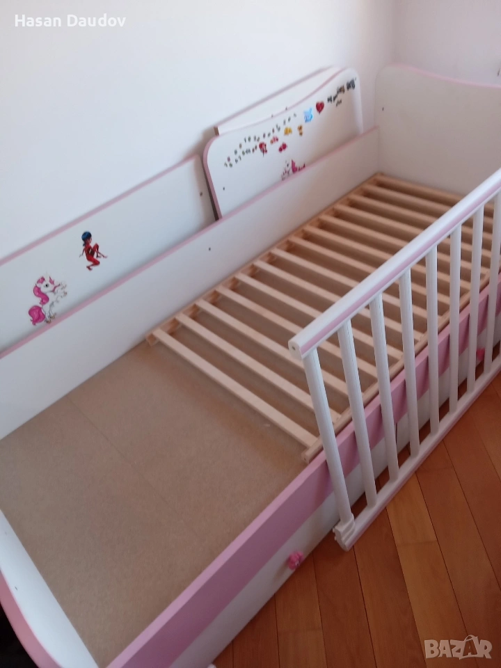 Леглото е в много добро състояние, на две нива,легло-кошара и голямо легло.Като кошара има и люлеещ се механизъм,.ешетка ,която се сваля.Отстрани има скрин к три чекмеджета ,а отдоло две големи чекмеджета. След като детето порасне,леглото се трансформира в голямо легло и ученическо бюро.
