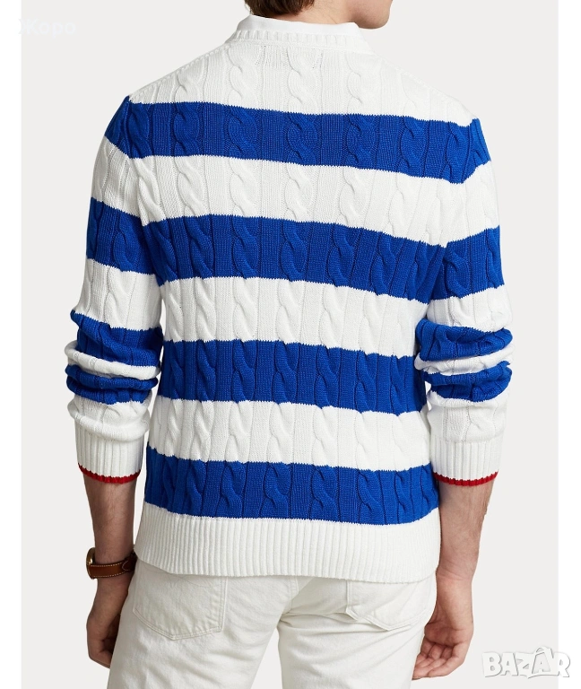 е класически кабелен плетен пуловер в бяло с сини хоризонтални райета и