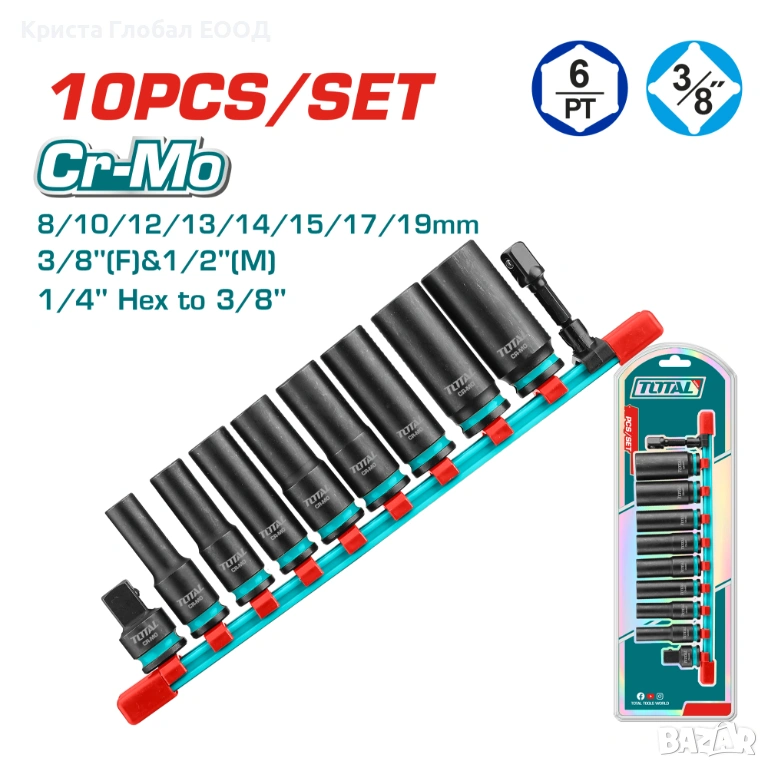 8 бр. удължени вложки: 8, 10, 12, 13, 14, 15, 17, 19 мм – най-често използваните размери.