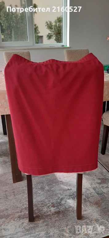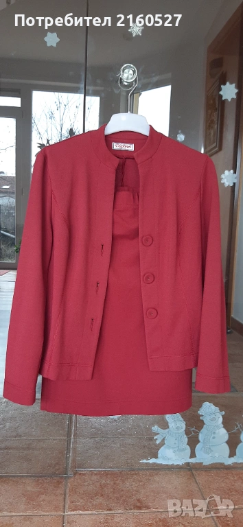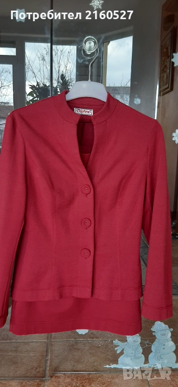 Костюмът е в цвят бордо, от "Дафне", р-р 38. Полата е с подплата, до коляното. Костюмът е подходящ за всеки сезон, но най-вече за пролет-есен. Много удобен и практичен.