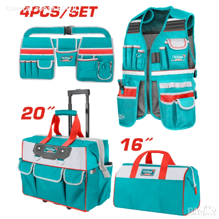 Пълен комплект за мобилна организация на инструменти от професионалната серия на TOTAL Industrial. Това не е поредната текстилна чанта, а цялостна система за пренасяне и съхранение, която няма нищо общо с масовите „куфари-играчки“.