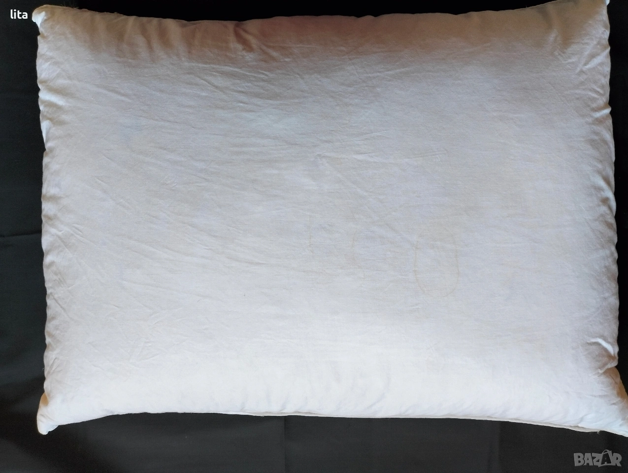 Използвана пухена възглавница в бял цвят. Възглавницата е в добро състояние и може да бъде използвана за спане или декорация.