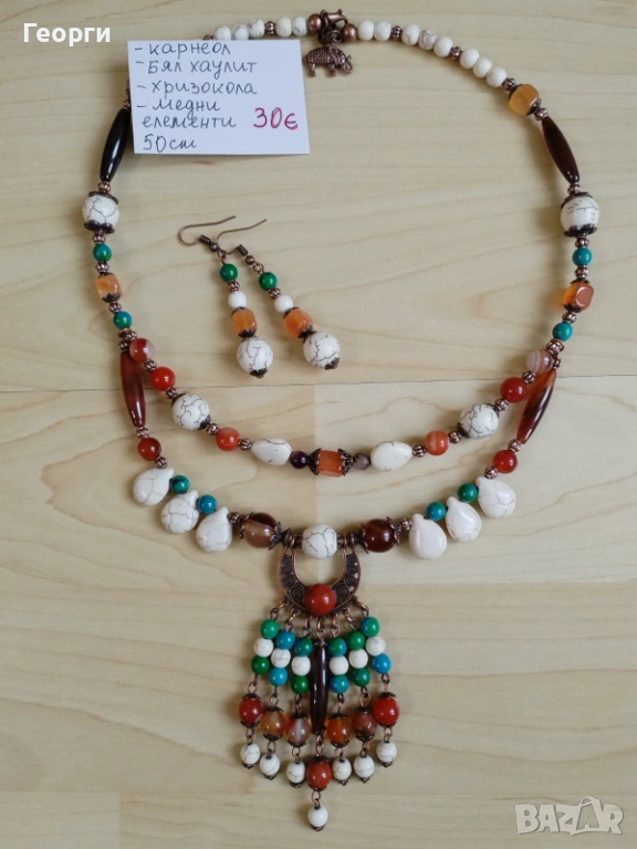 Ефектно дамско колие с естествени камъни – карнеол, бял хаулит и хризокола, комбинирани с красиви медни елементи и висящ декоративен елемент. Бижуто е ръчно изработено и е в единствен брой – стилен акцент за всяка визия.