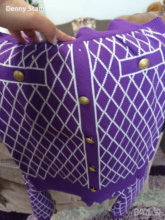 Лилав сет ( блузка и пола) от машинно плетиво. Гръдна на блузката до 100 см. На полата най -отгоре е паднало копчето. Има снимка