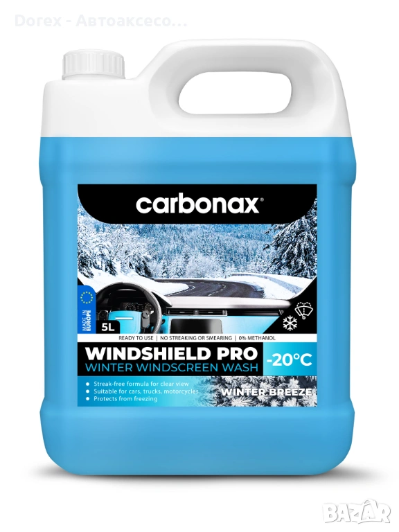 Високоефикасната зимна течност за чистачки CARBONAX® Windshield Pro почиства безпроблемно мръсни петна, пръски от кал, отлагания от соли и насекоми. С луксозен парфюмен аромат, който освежава купето. Устойчива на температури до -20°C.