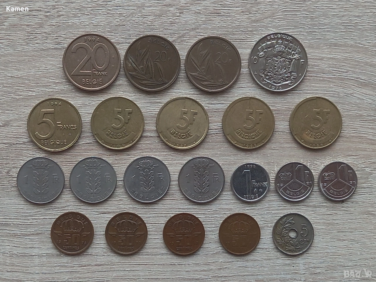 Продавам следните гръцки монети: 20 франка (1994) - надпис ,,België" 20 франка (1981) - надпис ,,België" 20 франка (1980) - надпис ,,België" 10 франка (1978) - надпис ,,Belgique" 5 франка (1994) - надпис ,,Belgique" 5 франка (1988) - надпис ,,België" 5 франка (1987) - надпис ,,België" 5 франка (1986) - надпис ,,België" 5 франка (1986) - надпис ,,Belgique" 1 франк (1996) - надпис ,,België" 1 франк (1991) - надпис ,,België" - 2 броя 1 франк (1977) - надпис ,,Belgique" 1 франк (1969) - надпис ,,Belgique" 1 франк (1963) - надпис ,,België" 1 франк (1956) - надпис ,,Belgique" 50 сантима (1975) - надпис ,,Belgique" 50 сантима (1970) - надпис ,,België" 50 сантима (1962) - надпис ,,Belgique" 50 сантима (1955) - надпис ,,Belgique" 5 сантима (1923) - надпис ,,Belguque" Продават се заедно, но приемам и договаряне на цената за избран от Вас брой монети.