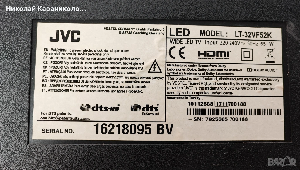 Продавам Power-17IPS62,Main-17MB110P,T.con-32T42-COK от тв JVC LT-32VF52K → Обява 53581895