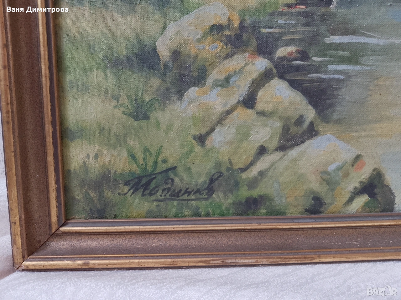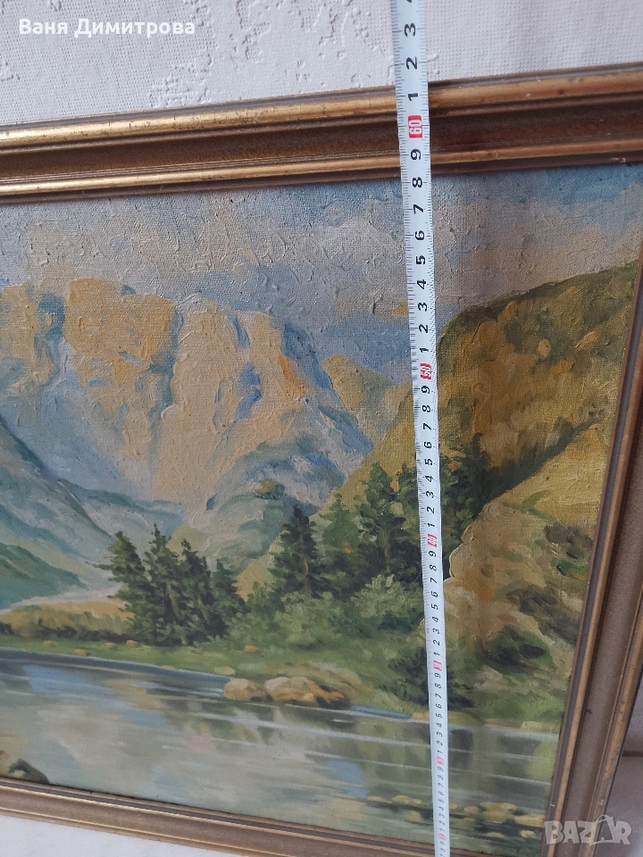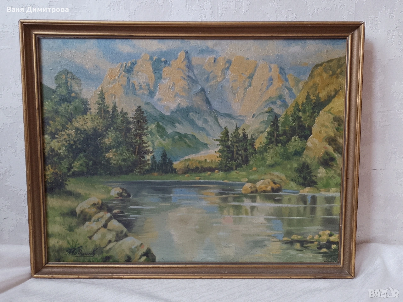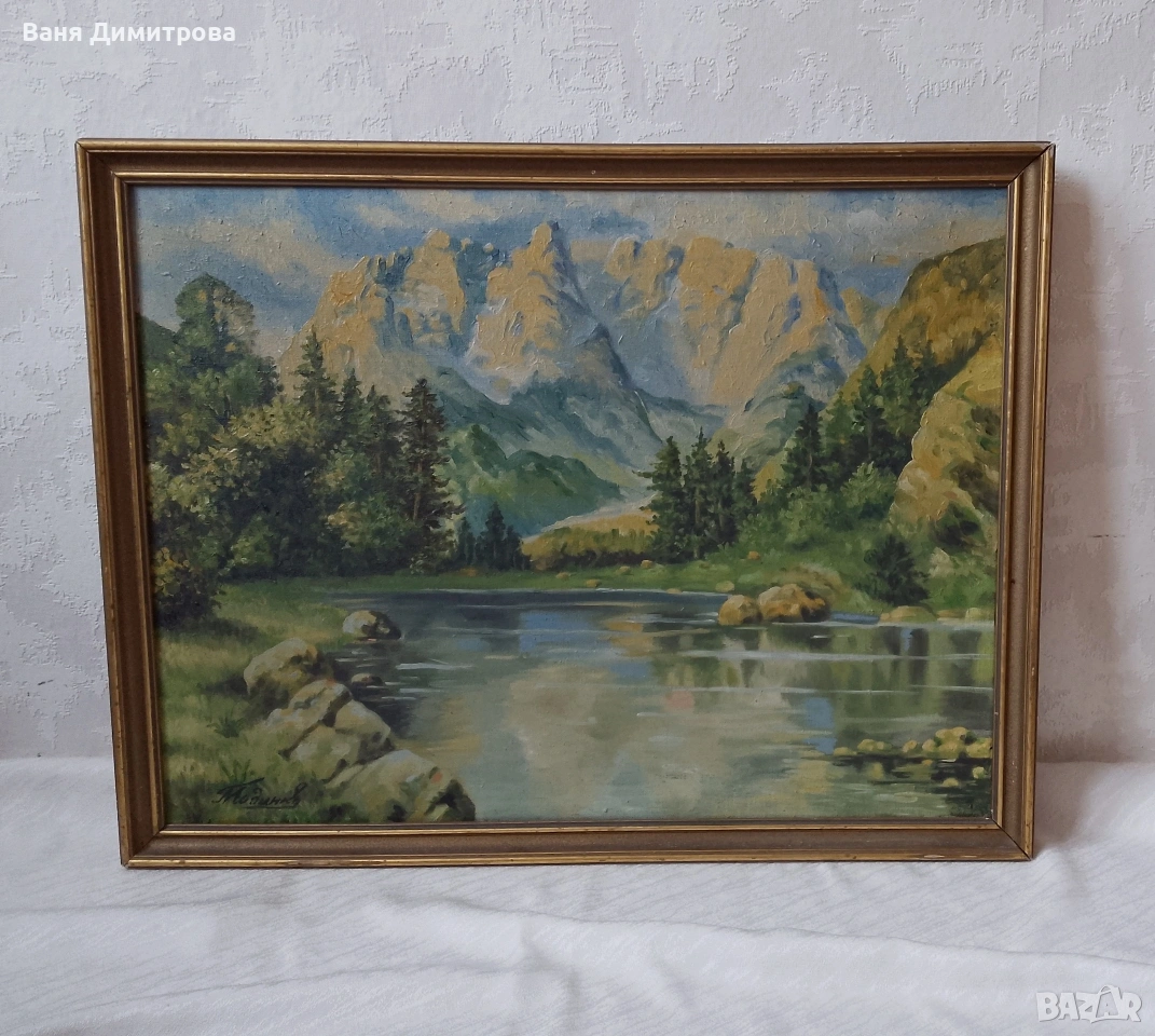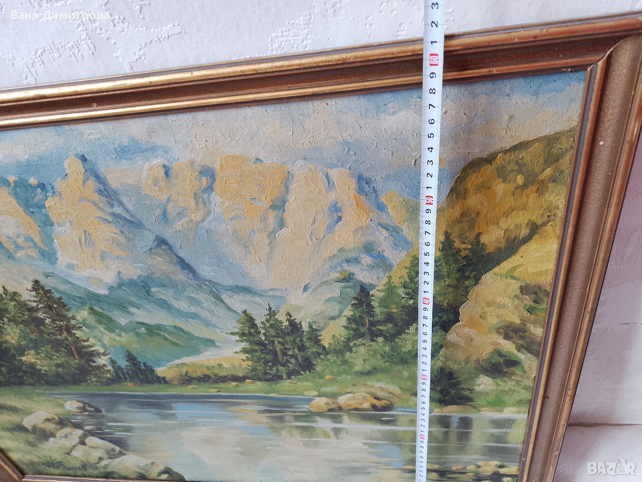 Очарователна маслена картина с впечатляващ планински пейзаж и спокойно езеро. Подписът на художника е в долния ляв ъгъл. Картина върху платно, размери 79×61,5 см, в много добро състояние . дребни забележки.