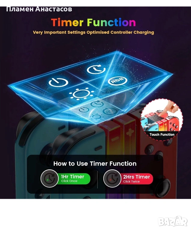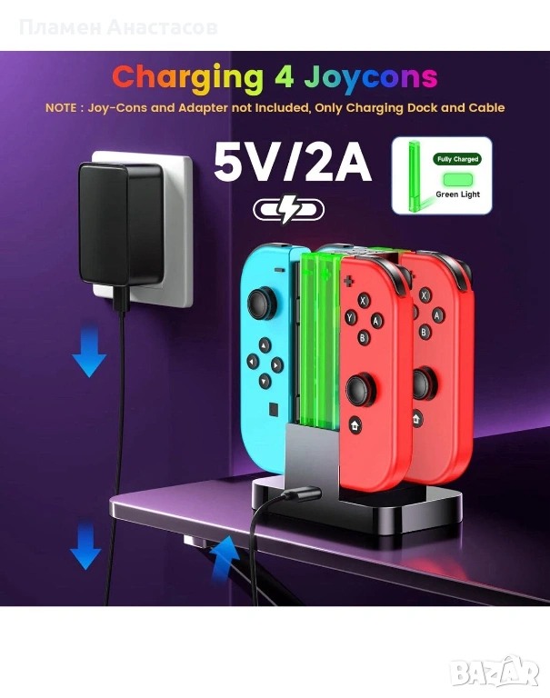 Продавам комплект аксесоари за Nintendo Switch, включващ RGB зарядна станция Wenocally и 2 безжични Bluetooth геймпада. Подходящ за Nintendo Switch и Switch OLED, идеален за мултиплейър игри у дома или като подарък за геймър.