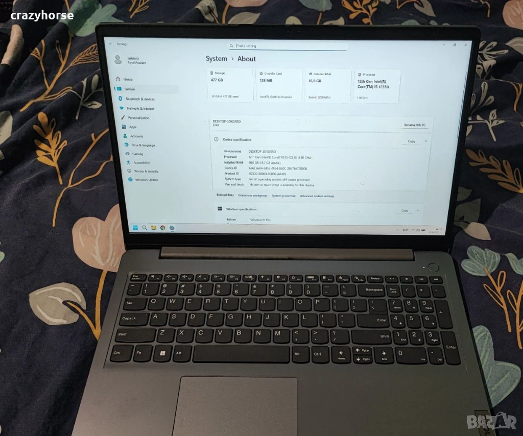 Чисто нов лаптоп Лаптоп Lenovo IdeaPad 3 15IAU7 i5-1235U/16GB/512GB NVMe с лицензирани Windows 11 Pro и Office 2024 Pro, както и основни програми. С гаранция 2 години е, която започна да тече на 04.02.2026г. и е до 04.02.2028г. като към него има фактура и гаранционна карта. Има забележка - драскотина на корпуса, която се вижда от снимките. Машината има следните параметри: процесор Intel® Core™ i5-1235U/16GB/512GB NVMe m.2, видео Intel® Iris™ Xe Graphics, дисплея е 15,6" Full HD, тегло 1,5 кг. Не се интересувам от бартери. Обявата важи за София, за други населени места пращам по Еконт за сметка на купувача с опция преглед и тест.