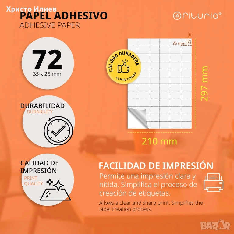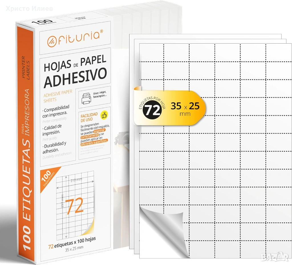 - Самозалепваща хартия за печат: Лист A4 със самозалепващи се етикети, размер A4. Един лист е с размери 210 x 297 мм и всеки лист съдържа 72 етикета с размери 25 x 35 мм, за да отпечатате най-добрите си творения. 100 листа, 7200 стикера.