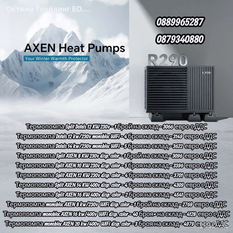 Термопомпа Split AXEN 10 KW 230v disp. color - 5 броя на склад - 3396 евро с ДДС