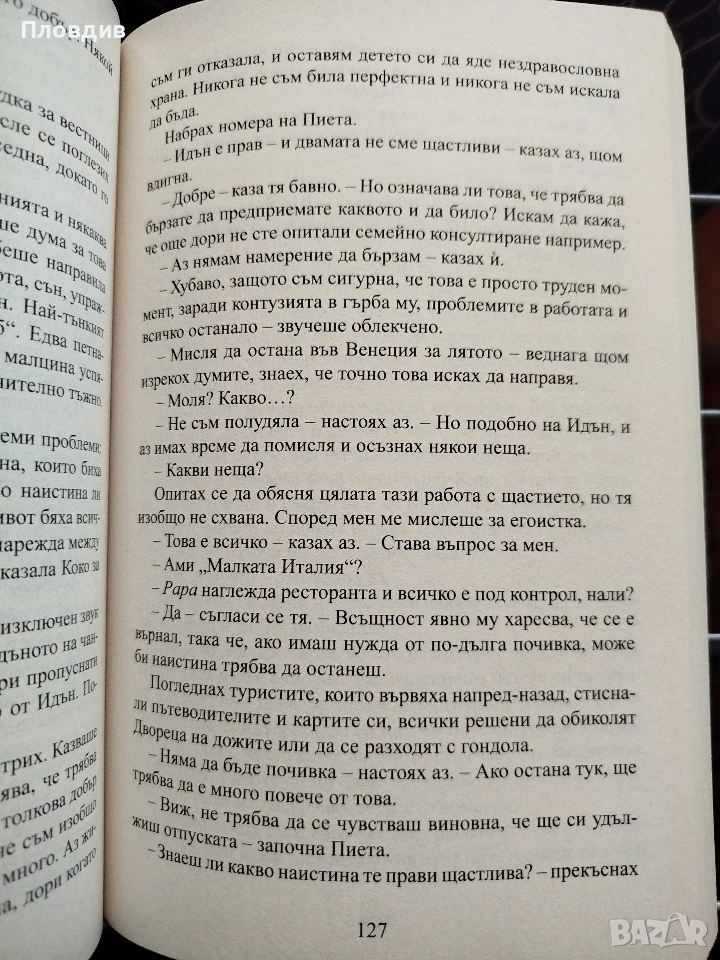 Книгата е в отлично състояние. Малко в стил Яж, моли се и обичай. На мен лично ми хареса.