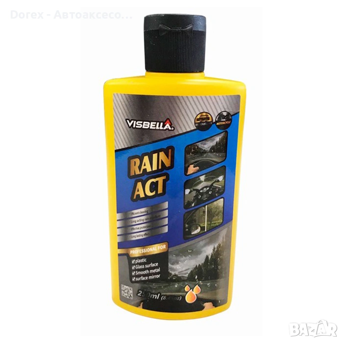 Visbella Rain Act е специално разработен препарат за подобряване на видимостта и безопасността при шофиране във всякакви метеорологични условия. Създава тънък хидрофобен слой върху стъклата, който отблъсква водата и позволява на капките бързо да се стичат.