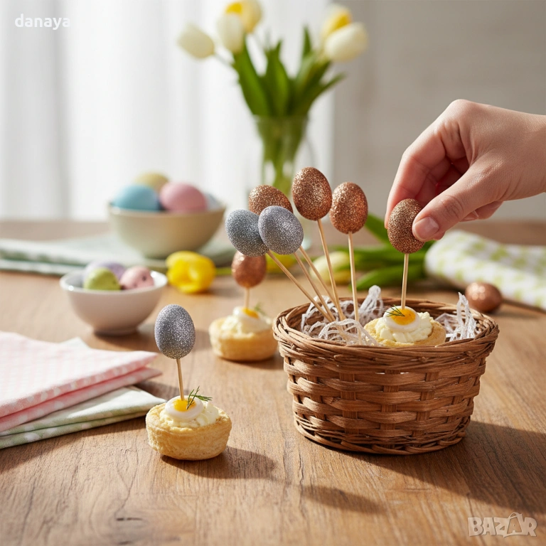 Великденски декоративни клечки за хапки с яйца са идеално решение за стилна великденска украса за маса и ефектно поднасяне на храна. Тези клечки за хапки за Великден съчетават практичност и празнична декорация, като превръщат всяко плато в акцент на празничната трапеза.