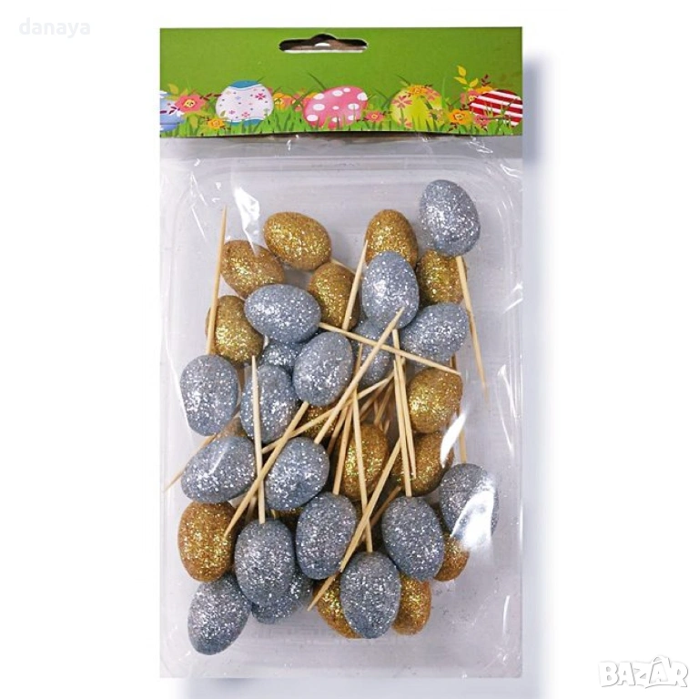 Комплектът включва 36 броя декоративни клечки за парти хапки, украсени с великденски яйца в златен и сребърен цвят, които придават елегантен и празничен вид. Подходящи са за сервиране на великденски хапки, предястия, сирена, плодове, мини сандвичи и десерти, както и за декорация на плата за гости.
