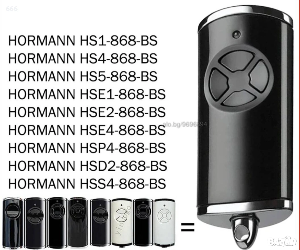 HORMANN Съвместимо дистанционно управление: HORMANN BS Bisecur 868.30Mhz. HORMANN HS1-868-BS, HS4-868-BS, HS5-868-BS. HORMANN HSE1-868-BS, HSE2-868-BS, HSE4-868-BS. HORMANN HSP4-868-BS. HORMANN HSD2-868-BS-A, HSD2-868-BS-C.