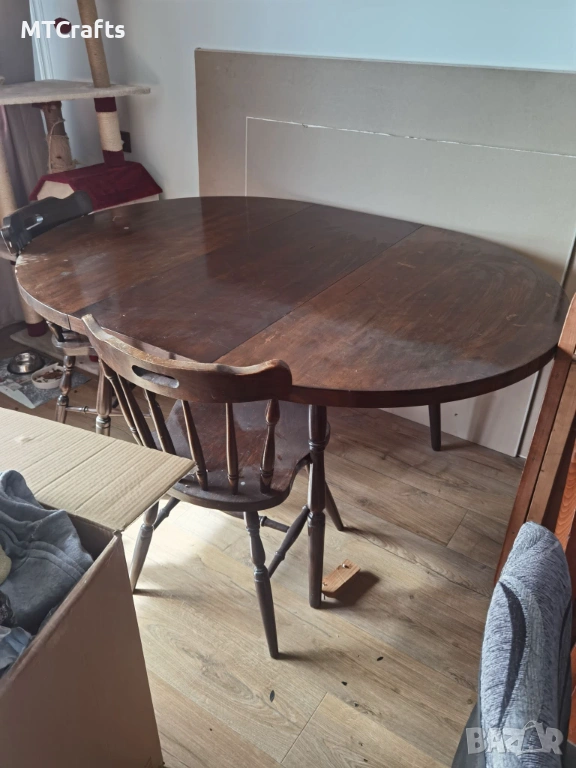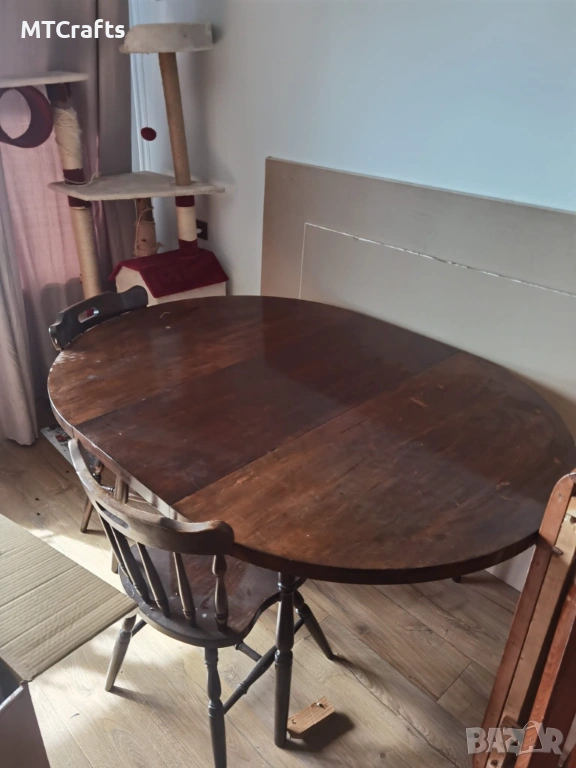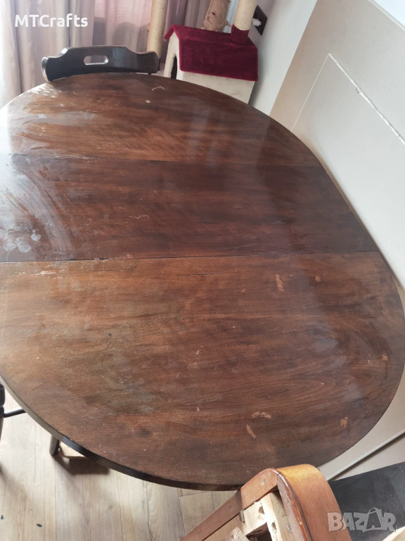 Продавам здрава и стабилна разтегателна маса, изработена от масивно дърво. Масата е много здрава като конструкция, но плотът има видими следи от употреба, които съм снимал отблизо.