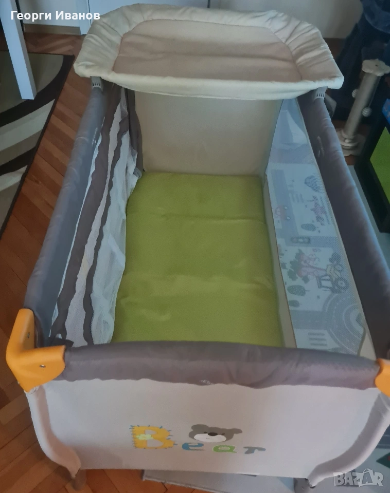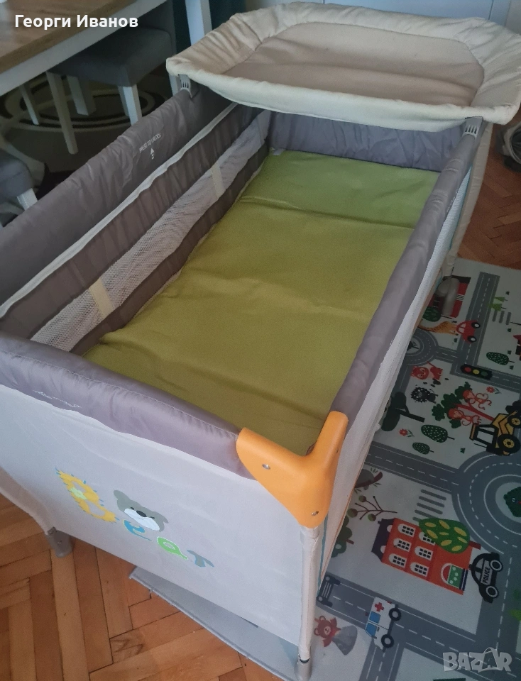 Сгъваемо детско легло много запазено. Удобно за траспортиране има колелца и в сгъваема форма заема място колкото един куфар. Има две нива за разположение на сгъваемия матрак. В комплекта има включен и повивалник.