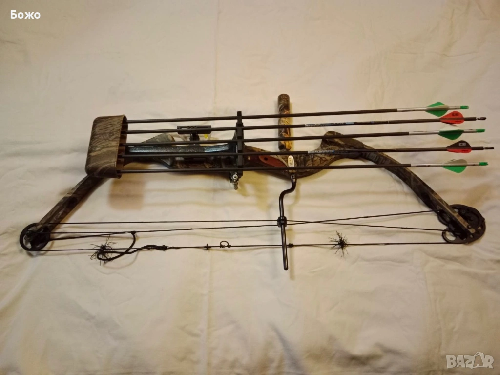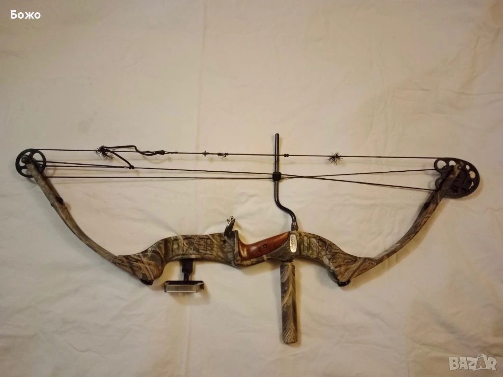 Лъкът ми е подарен преди години от белгийски ловци, на които бях домакин по време на пребиваването им в България. Качествена изработка с корпус от анодиран алуминий и ергономична ръкохватка от полирано орехово дърво, няма нищо общо със съвременните “пластмасовки”, на които е посочена мощност от 70 либри, а без проблем ще ги опъне и юноша. Лично съм го ползвал, много точен и мощен уред, но вече поостарях и въпреки, че съм намалил донякъде силата му, вече го опъвам много трудно. Сега съм развил винтовете за мощността с пет оборота, защото когато са завити докрай, изобщо не мога да го опъна. Тази брутална мощ се дължи на масивните и яки рамена, но и на това, че ексцентриците (камовете) в краищата на лъка са с различна големина, които, подобно на скрипец позволяват на раменете да се свият сравнително лесно, а после отдават цялата си експлозивна сила на стрелата.