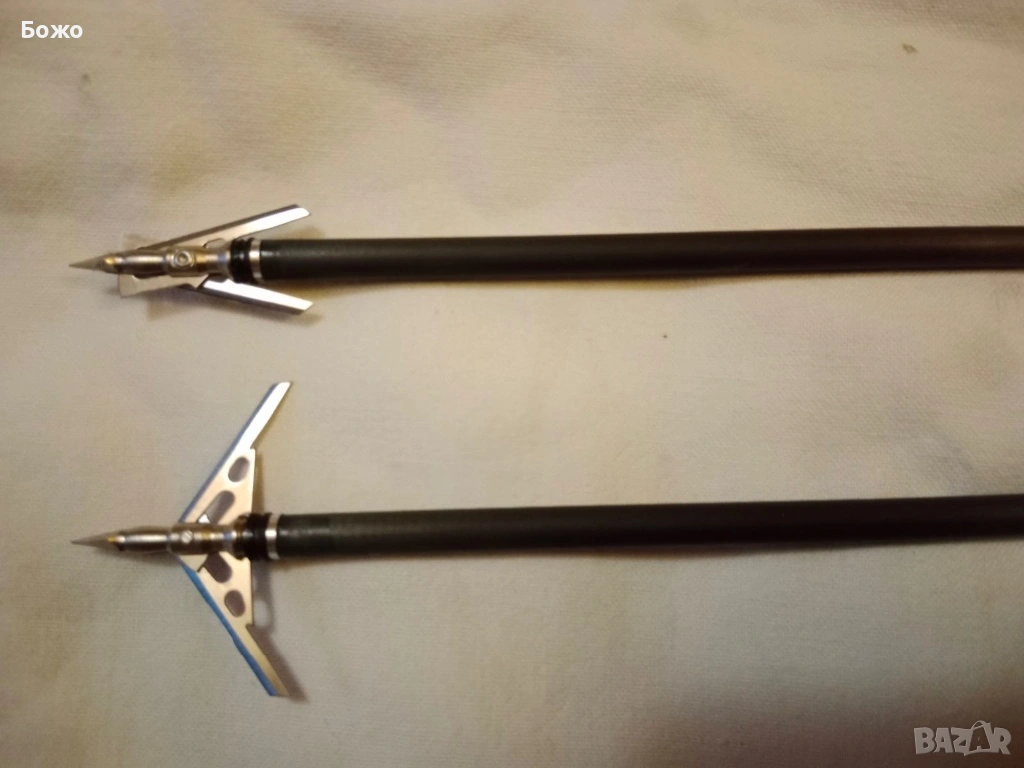 Ловните върхове са механични, летят затворени, а при удар в целта режещите остриета се разтварят и правят прорез от два инча, това са пет сантиметра. Марката на върховете е “RAGE” - “ярост”, а моделът - “Hypodermic”.