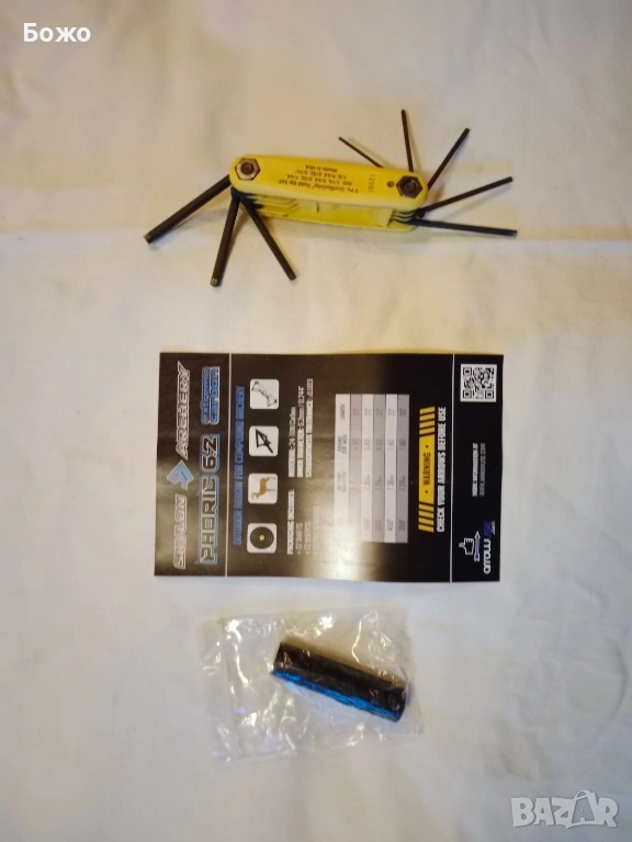 Също така купувачът ще получи един флакон смазка за тетивата и комплект шестограмни ключове, събрани в обща ръкохватка, подходящи за всички винтчета по лъка.