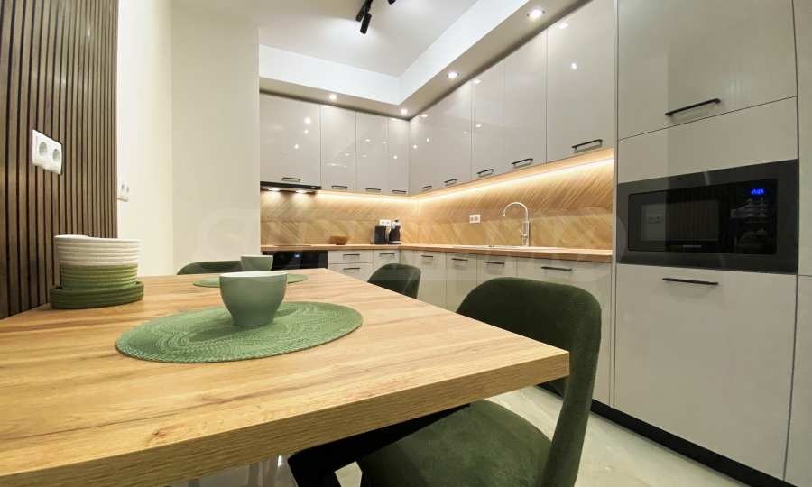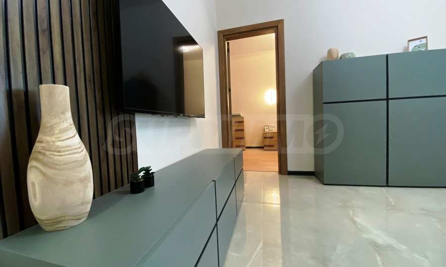 панорамна тераса.Апартаментът е уютно обзаведен по дизайнерски проект и оборудван с нови мебели и ел. уреди от най-висок клас в гаранция, включително съдомиялна. Отоплението и охлаждането са решени с нови инверторни климатици във всяка стая. Разполага с оптичен нет и два smart TV.