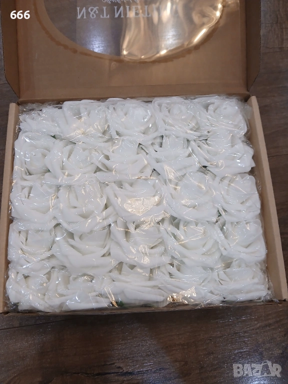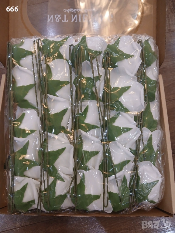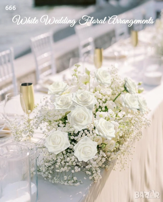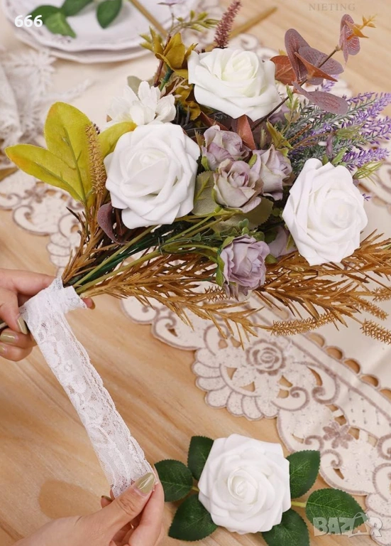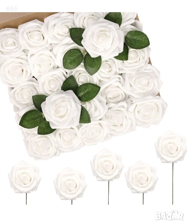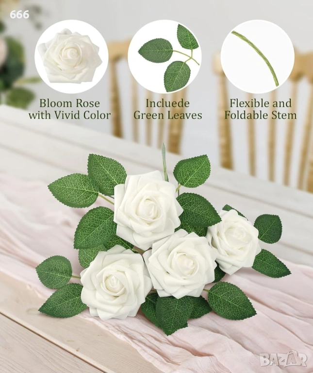 Съдържание: 4 листа и 1 ароматна картичка за всеки 50 цвята. Изкуствените цветя от бяла роза са с обща дължина около 18 см (със стъблото) и 8 см ширина. Те имат този кадифен вид, който ги прави да изглеждат като истински рози. Смесени с истински цветя в централната украса, не можехте да различите кое е истинско и кое изкуствено.