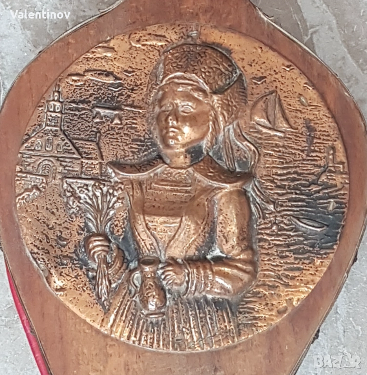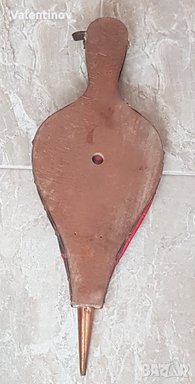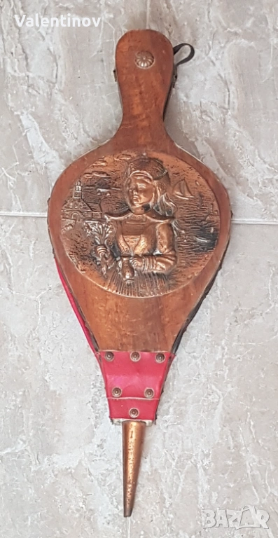 Старинна, дървена духалка за разпалване на огън, медна плака отпред, мехът е здрав, дължина- 49,5см.