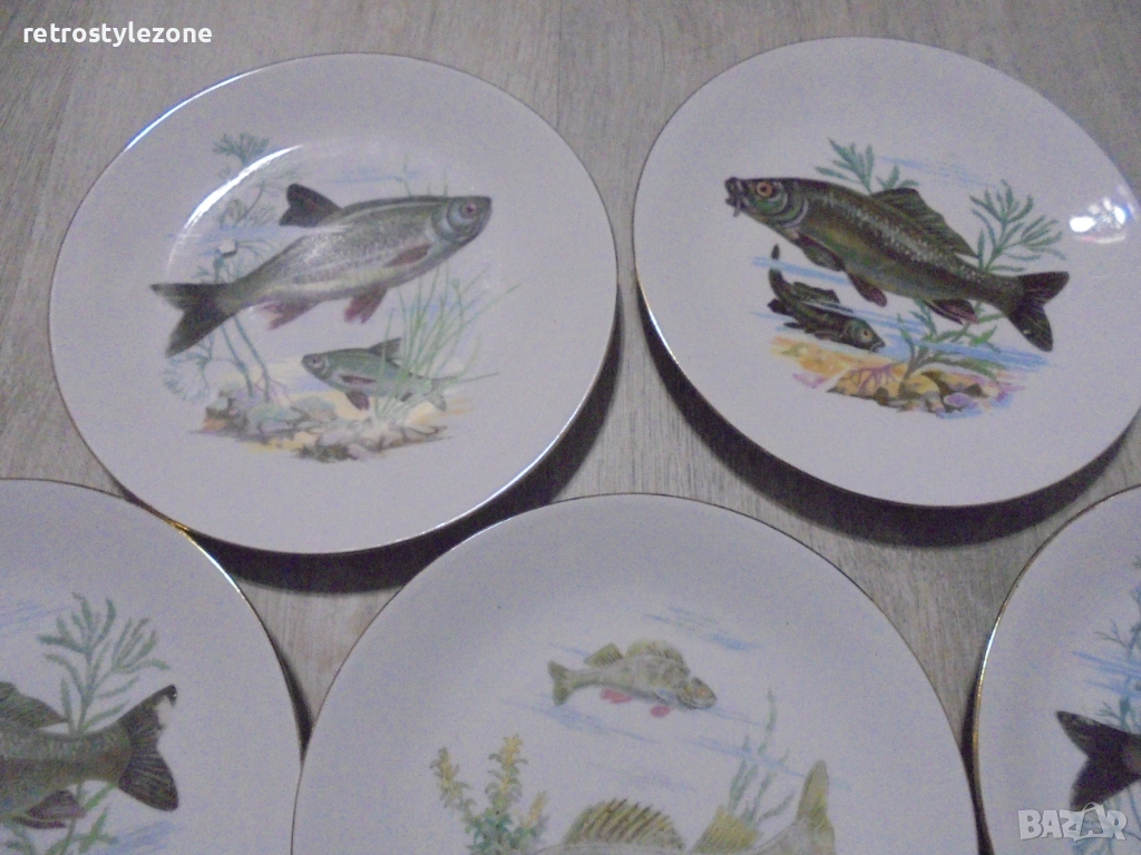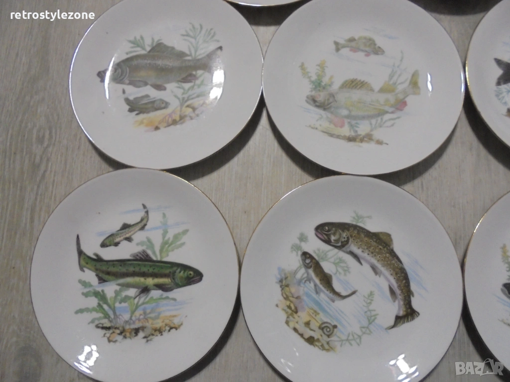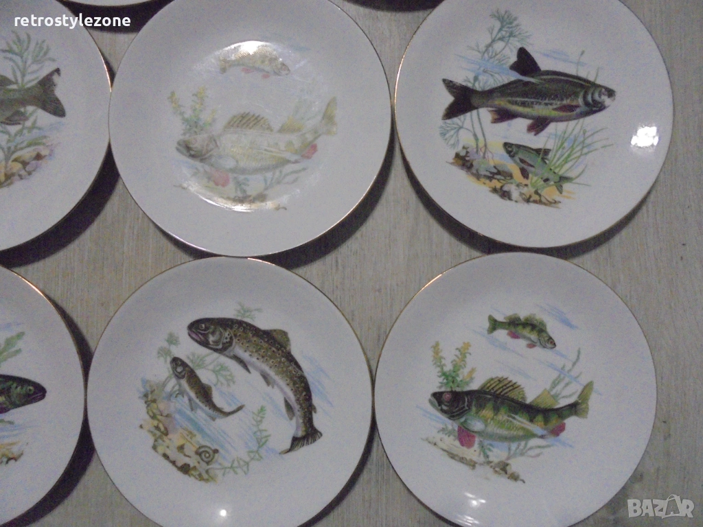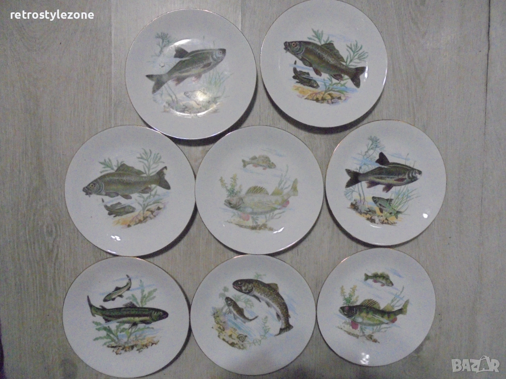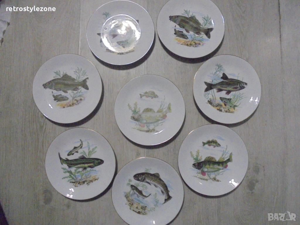 Комплект от 8 броя стари порцеланови чинии KAHLA (Germany) с красиви илюстрации на различни сладководни риби. Подходящи както за сервиране, така и за декорация (рибарска къща, вила, механа).
