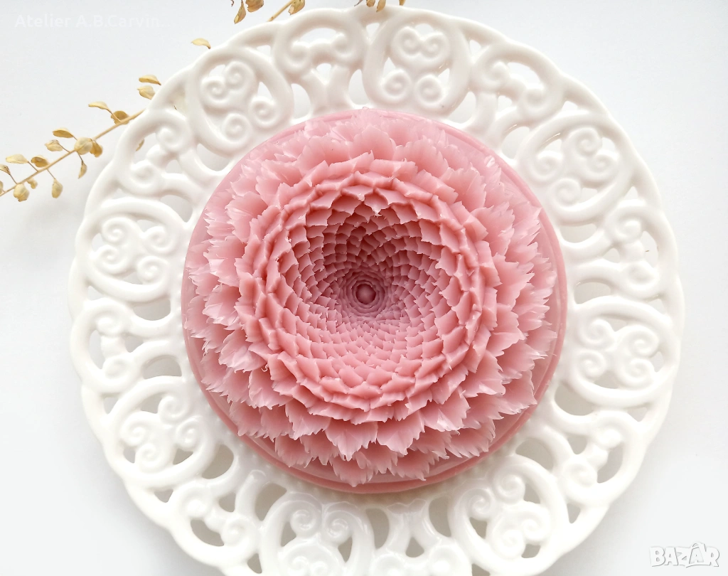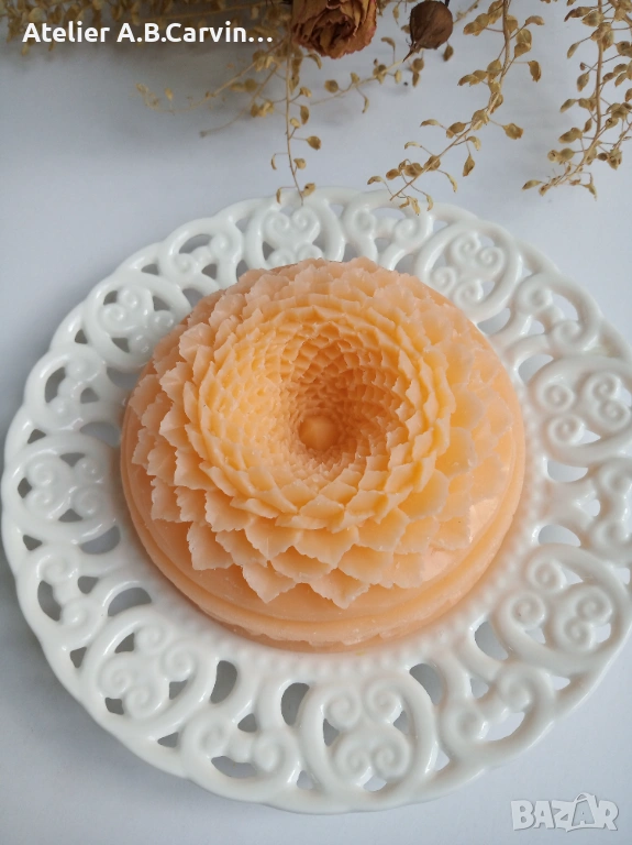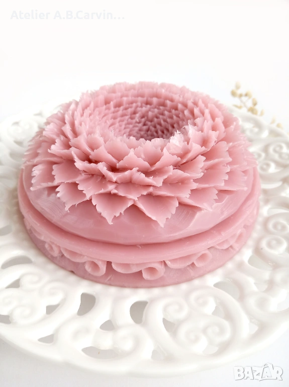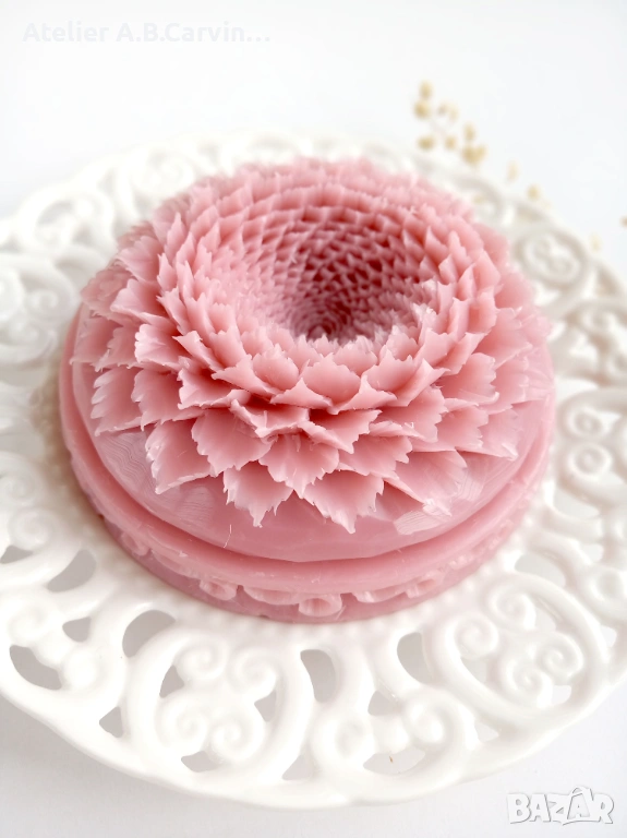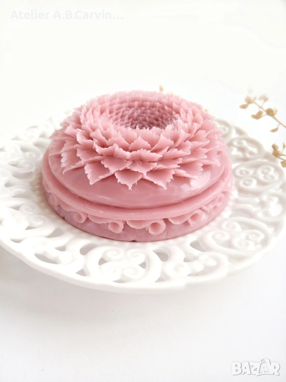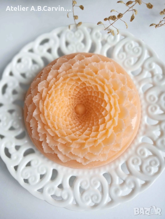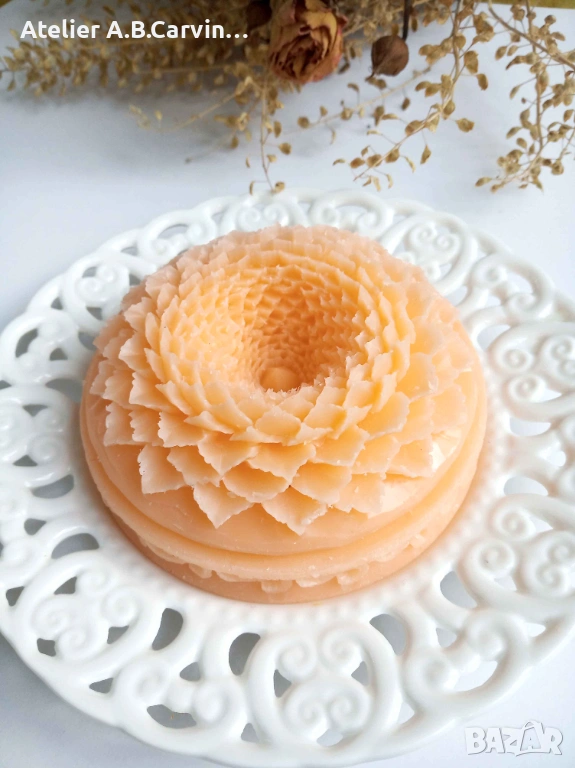 Изцяло ръчна изработка с нож, без молдове, с добавени фини декоративни детайли. Уникално произведение на приложното изкуство с нежен аромат. Идеален подарък за ценители.“Ръчно гравиран с внимание към детайла, изработен от сапунена база с натурални масла и аромати, сапунът е идеален подарък за любимите ви при различни поводи.