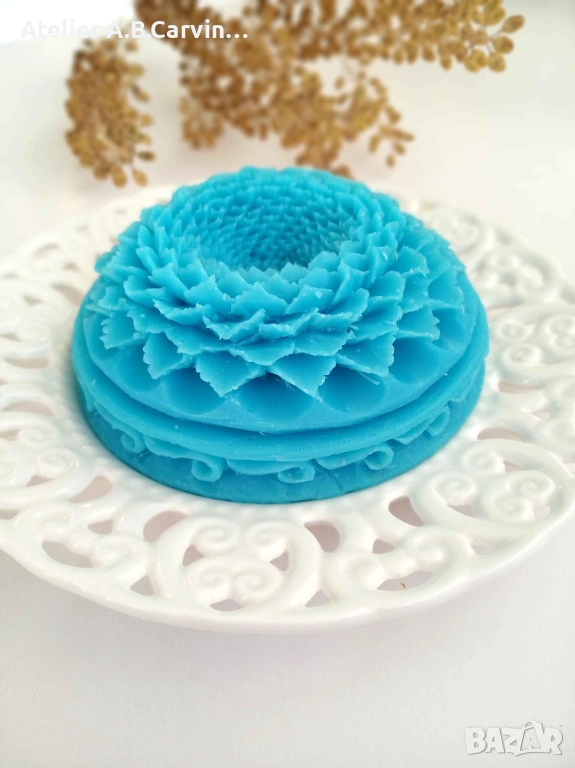 Този артикул е истинско доказателство за възможностите на ръчната изработка, като всеки елемент е внимателно изрязан с нож върху наситена синя глицеринова база. Дизайнът се отличава с многослойни флорални мотиви, допълнени от нежни декоративни акценти, които му придават кралско излъчване. Поради изцяло ръчния процес на изработка без използване на калъпи, всяка бройка притежава свой индивидуален характер. Сапунът излъчва успокояващ аромат и е предназначен за декоративна употреба, превръщайки се в централен елемент във вашата баня или уникален подарък за специални поводи. С този продукт от