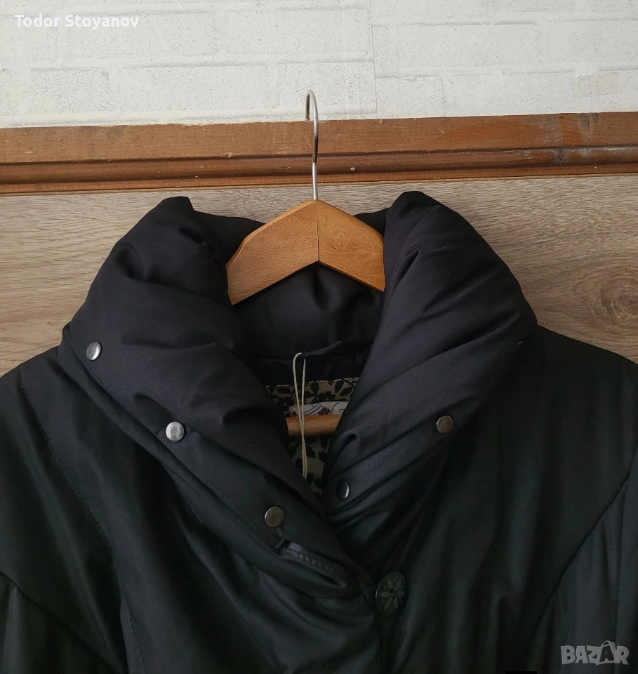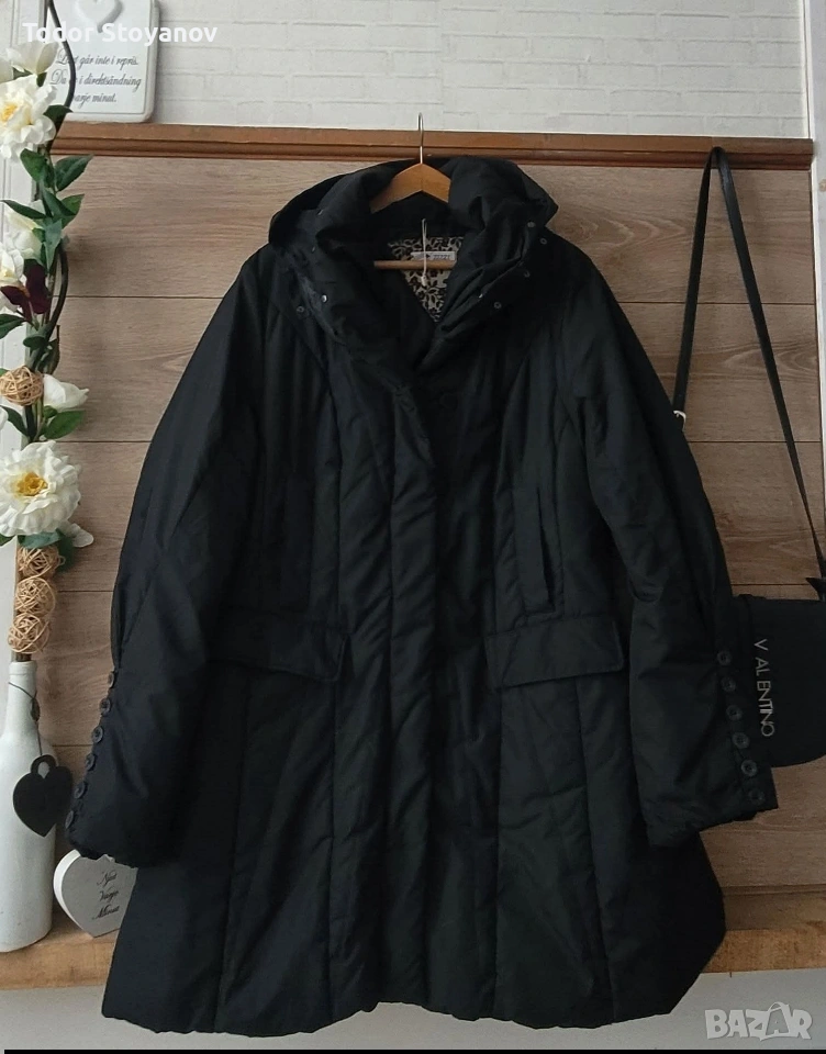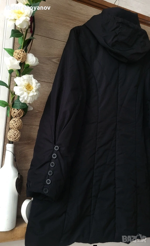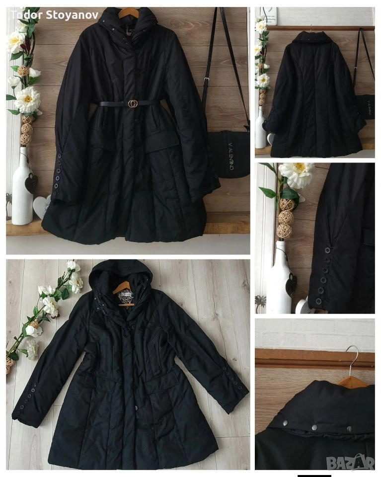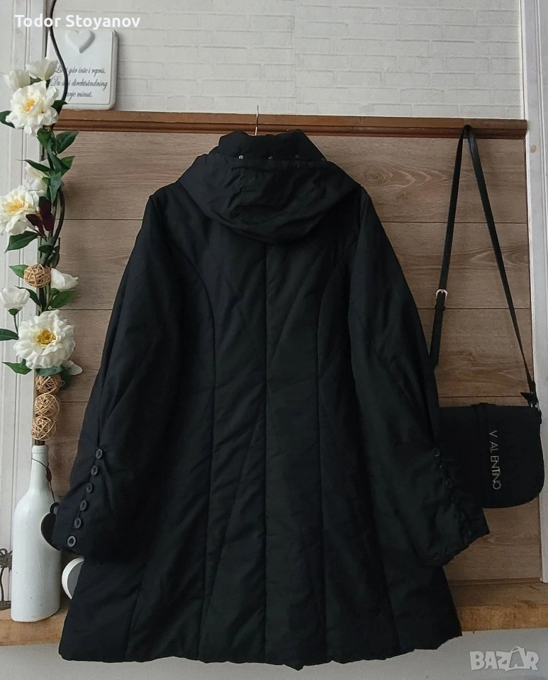 Много красив модел черно яке със скрита качулка в яката ZIZZI. Модела е с леко вталена кройка в талията и разкроено в ханша. Закопчаване цип и копчета на цветя. Четири предни джоба. Ефектни ръкави завършващи с копчета. Пълнеж вата. Олекотено и удобни както за ежедневието така и за над рокля за по-елегантни визии. Дължина 90см, гръдна до 124см. Рамене 45см. Отговаря на Л/ХЛ. Като ново! Цвна 40€ ( без коланчето от снимката) Още снимки в коментар