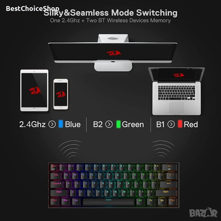 С вградени надградени 3.0/5.0 Bluetooth и 2.4Ghz безжични чипове, K530 Pro предлага истинска безжична връзка без забавяне за всички устройства. Осъществявайте лесно превключване между 3 различни безжични устройства чрез страничен превключвател (2.4 Ghz/BT1/BT2).