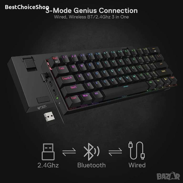 Тази клавиатура е снабдена с иновативна технология за свързване в 3 режима (USB-C, BT 3.0/5.0 и 2.4 Ghz), които правят потребителското изживяване надстроено до друго ниво във всички области.