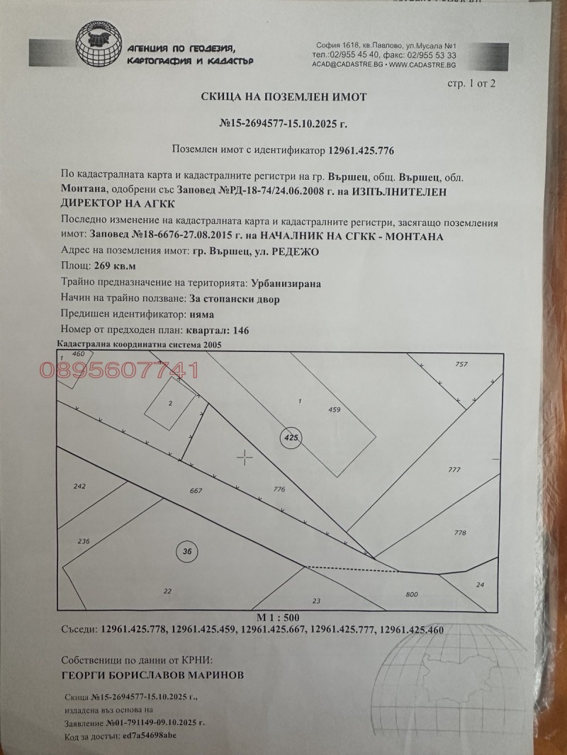 Предлагаме за продажба поземлен имот с площ от 269 кв.м., находящ се в гр. Вършец, обл. Монтана.