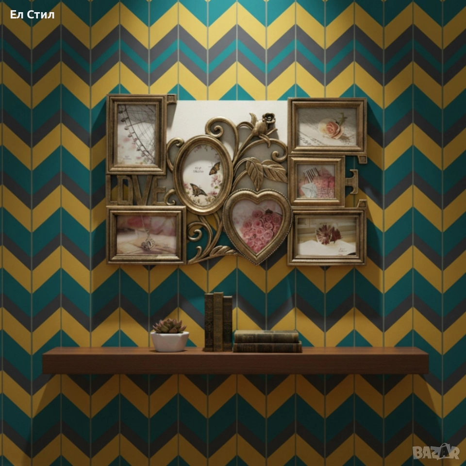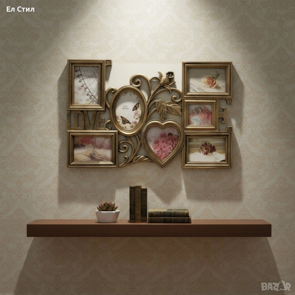 Снимките ти са разпръснати, а у дома липсва романтичен акцент? Многорамковата фоторамка Love (61×40,5 см) събира до седем снимки в различни форми – овал, сърце, правоъгълник – и ги обединява под надписа „Love“. Елегантният декоративен елемент с листа и роза подчертава темата, а изборът между бяло и антично бронзово позволява да се впише в различни интериори. Изработена от здрава пластмаса със стъклени панели, рамката се монтира лесно на стена, снимките се сменят без усилие и остават защитени от прах. Няма нужда от множество отделни рамки – получаваш цялостна композиция с един монтаж. Тя съчетава практичност и емоция, превръщайки се в акцент във всяка стая. Така подреждаш спомените си, освежаваш дома и имаш прекрасен подарък за близки.