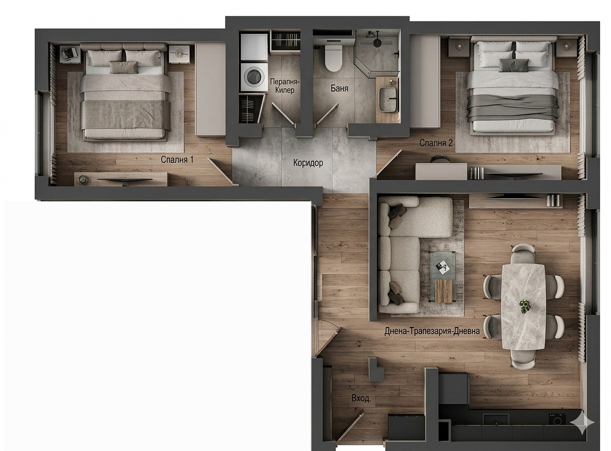 Жилището е с практично и търсено разпределение входно антре, светла дневна с кухненски бокс, две спални, баня с тоалетнА и склад. Реални квадрати, без излишни общи части всичко е използваемо и функционално.