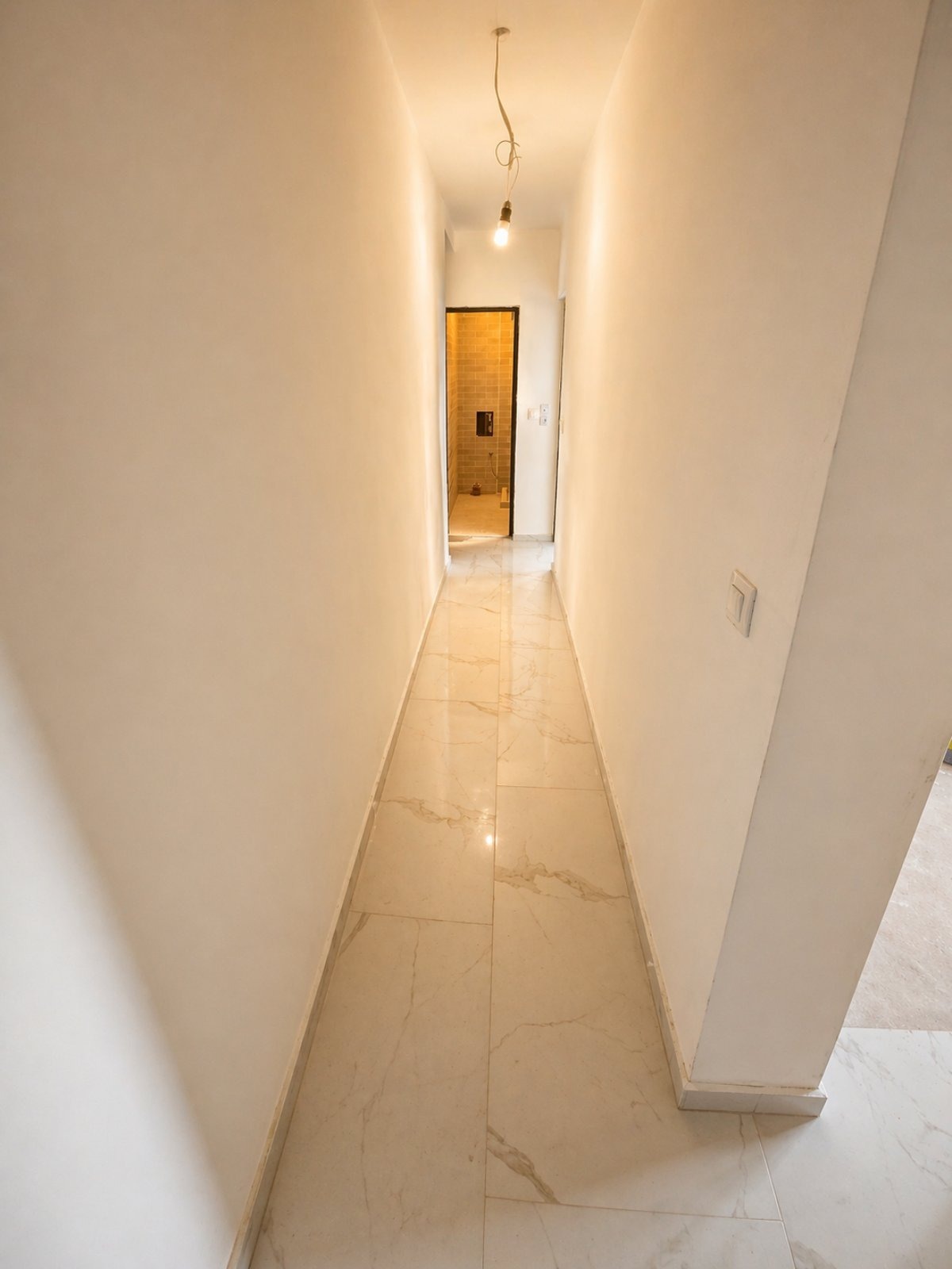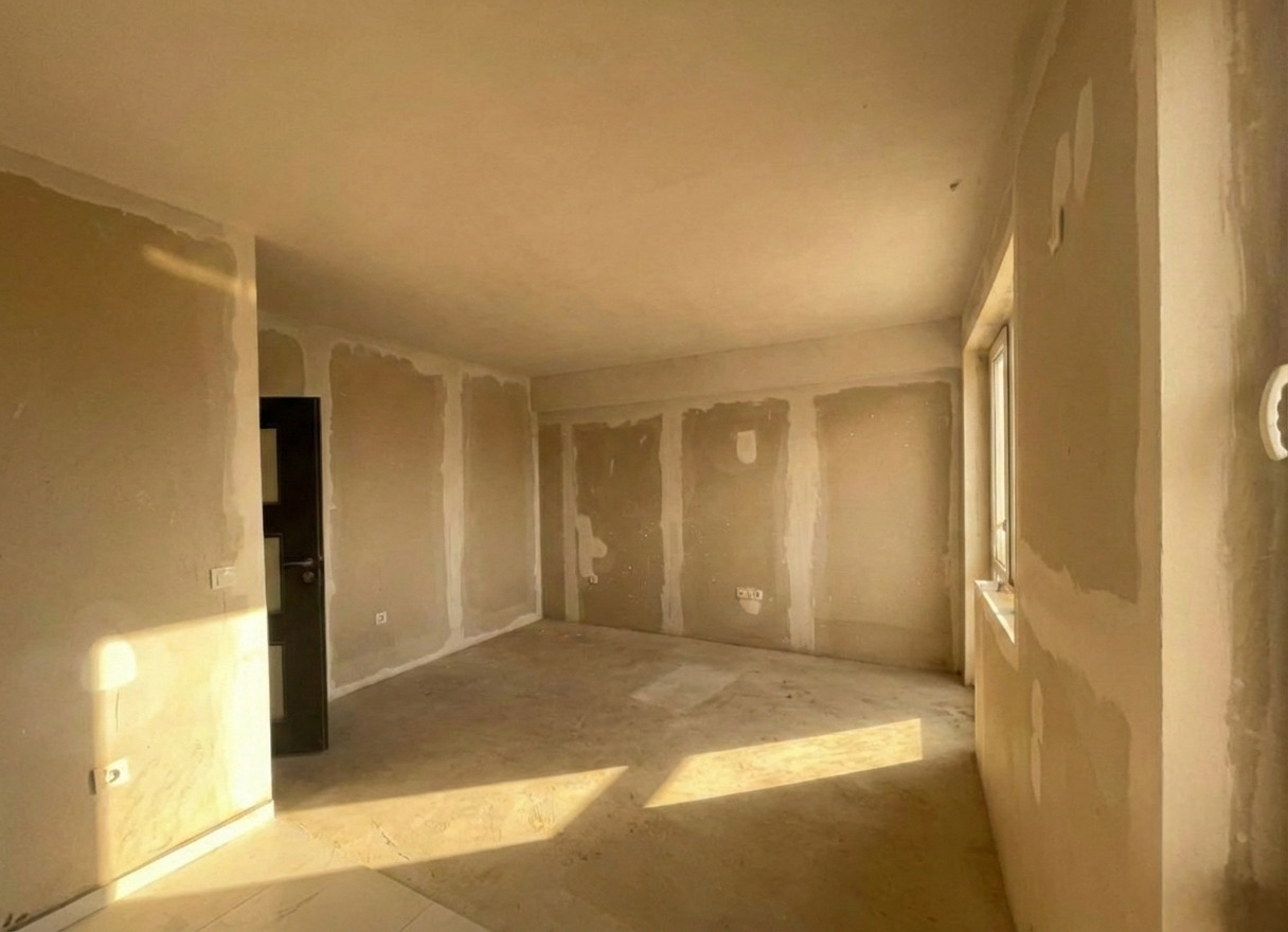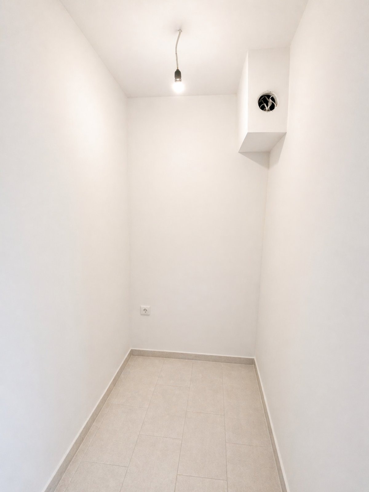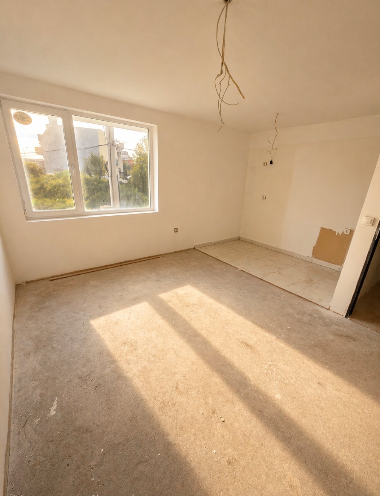 Банята е с положена хидроизолация и плочки, гранитогрес първо качество в коридора, складовото помещение и зоната на кухненския бокс. Монтирани интериорни врати, напълно изградена ВиК инсталация с водомери и спирателни кранове, бойлер 80L, поставени ключове и контакти. По желание финишна шпакловка срещу допълнително договаряне.