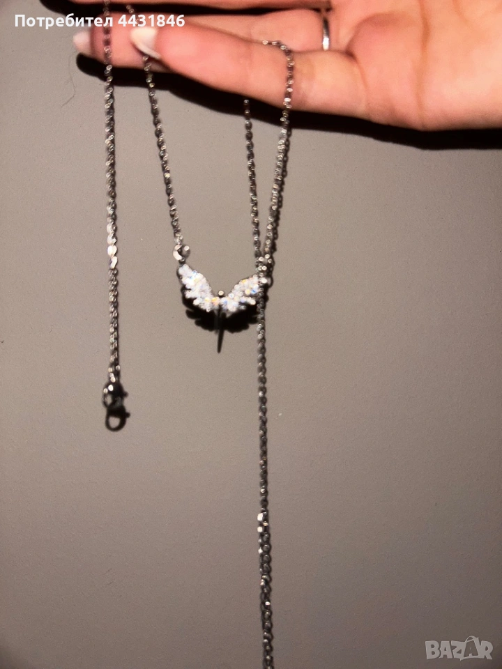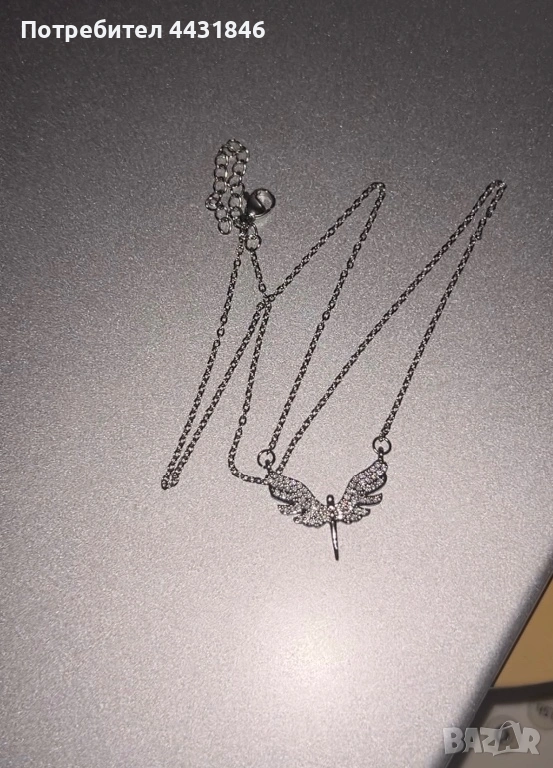 Елегантно колие с крила, изработено в метален нюанс и инкрустирано с блестящи кристали. Фината верижка и детайлната висулка създават стилен и модерен акцент, който придава нежност и характер на всяка визия.