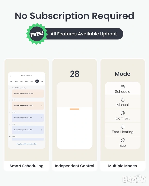 Управление чрез приложение: Управлявайте директно чрез Bluetooth и достъпвайте различни безплатни функции, включително интелигентно планиране, наблюдение на температурата и разпознаване на състоянието на прозорците, което ви помага да спестите както енергия, така и разходи. Включва също автоматично отстраняване на котлен камък и защита от замръзване, за да осигурите цялостна безопасност на вашата отоплителна система.